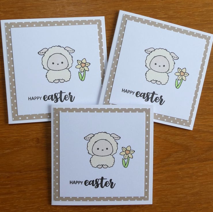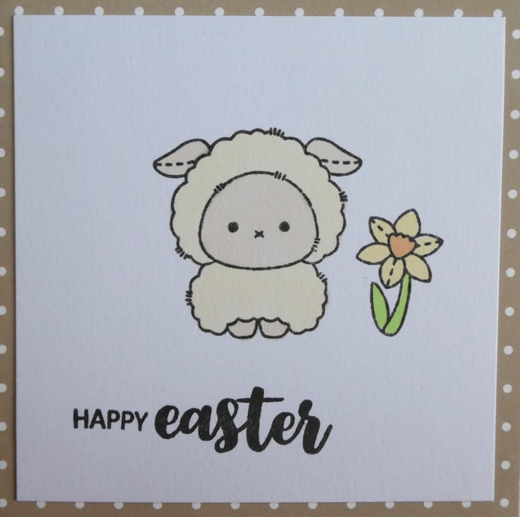 The cards have been handed stamped with images of a cute plushie style sheep and a daffodil and then hand coloured in pastel shades of cream, lemon, peach and green, using alcohol markers. The message Happy Easter has then been hand stamped in black archival ink.