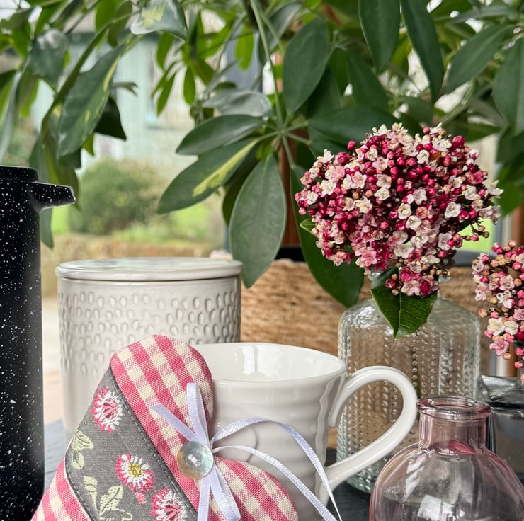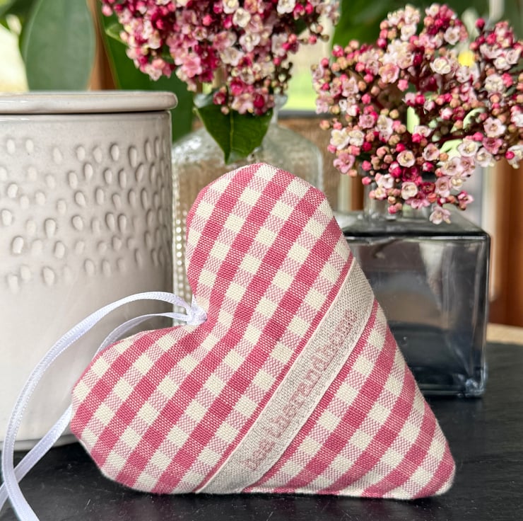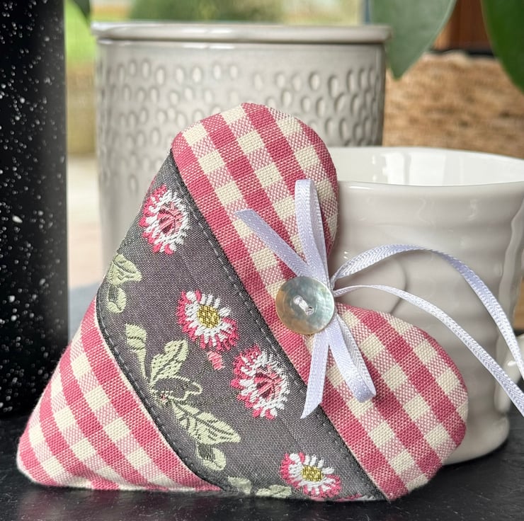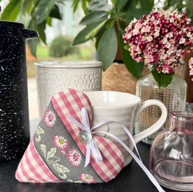 This February heart is in pink gingham with a pretty woven ribbon featuring beautiful pink and white wild daisies, and pale sage-green leaves, against a cloud-grey background.
