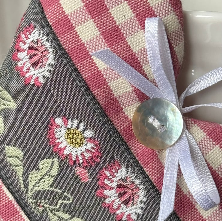 Generously filled with gloriously fragrant and locally grown Hampshire lavender and finished with a shimmery mother-of-pearl round button, a white satin ribbon bow and hanging ties, and with a linen 'heatherandhome' label on the reverse side.