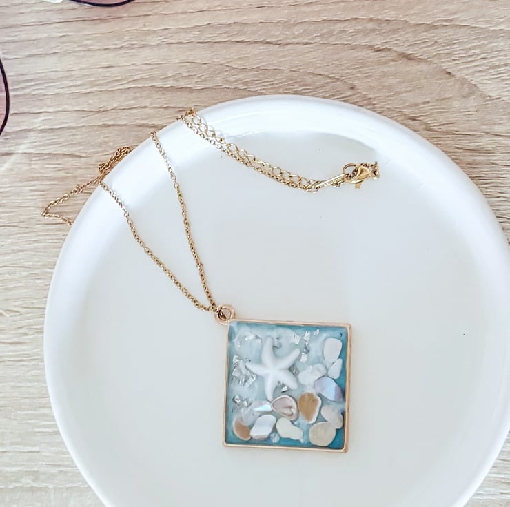 Set within a gold-toned square frame, this coastal-inspired design features a white starfish centre surrounded by natural shell fragments and tiny pebbles, suspended in layered ocean-blue resin.
