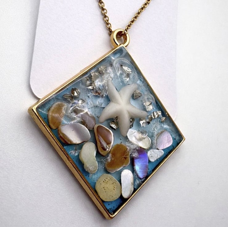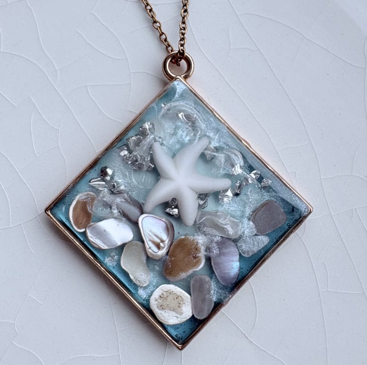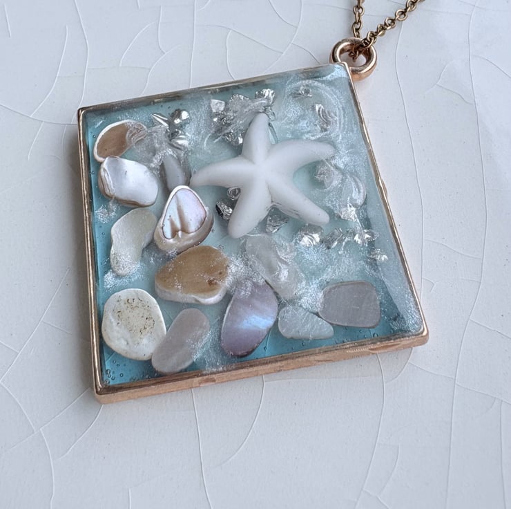 This item is handmade using UV resin and contains small shell and pebble fragments. Chain and findings are stainless steel Not suitable for young children due to small parts Avoid prolonged exposure to water, perfumes, lotions and high heat Do not bend or apply pressure to the pendant If irritation occurs, discontinue use This piece is intended as decorative jewellery and should be handled with care to preserve its finish.