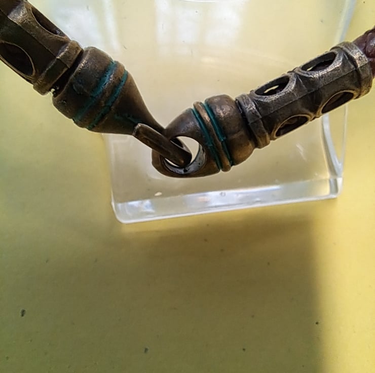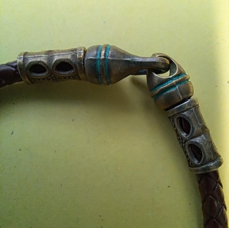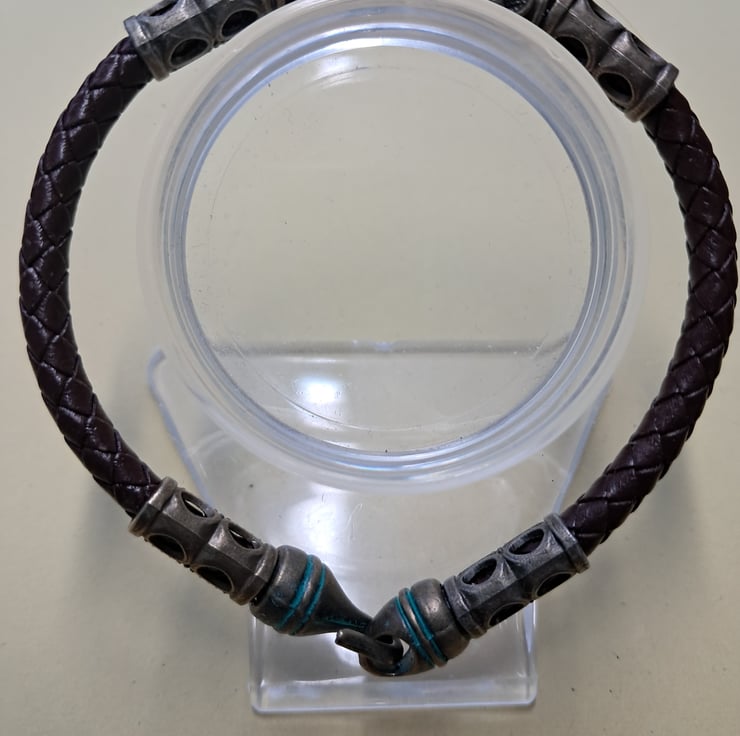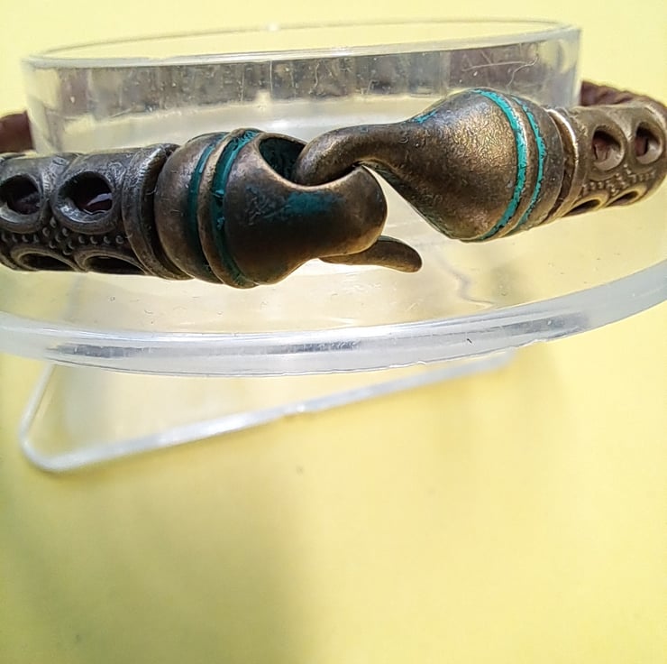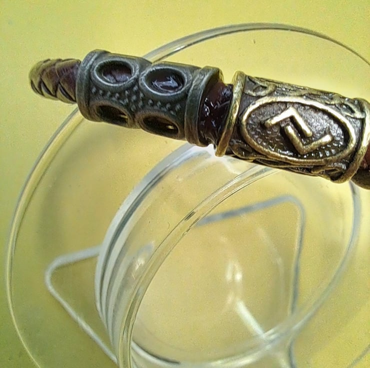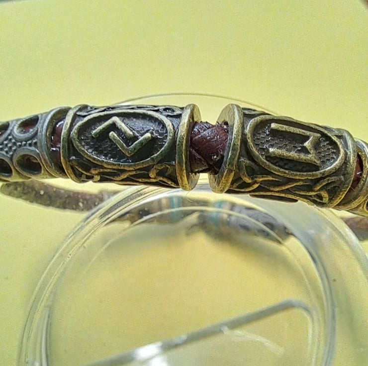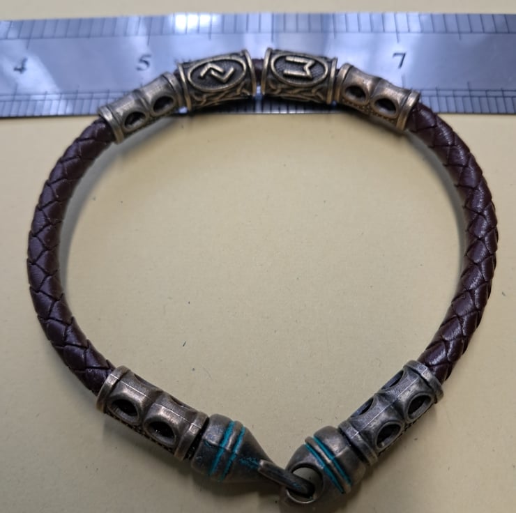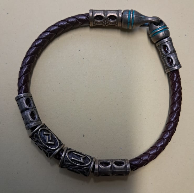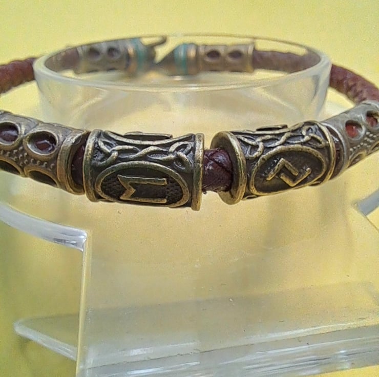 Leather Viking Rune bracelet with 6mm Dark Brown Plaited leather cord, Bronze spacers and 2 Runes. With bronze Patina Hook fastener. Will fit up to 7.50" wrist. Handcrafted. Thankyou for looking. Lori
