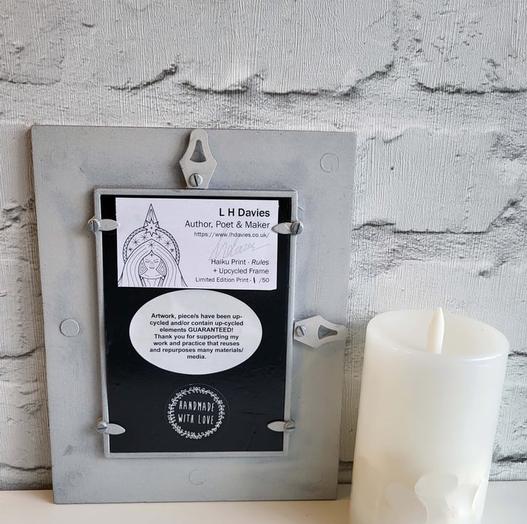 Included in the Perfectly Imperfect Event as this is an idea prototype; I have experimented with upcycling/repainting the frame (transforming an unwanted product into a new and higher quality piece) and the frame is combined with the 'Rules' Haiku Print. Due to this being a previously used frame there are also some very minor marks/flaws on a few areas of the frame (mainly on the back and out of sight when hung).