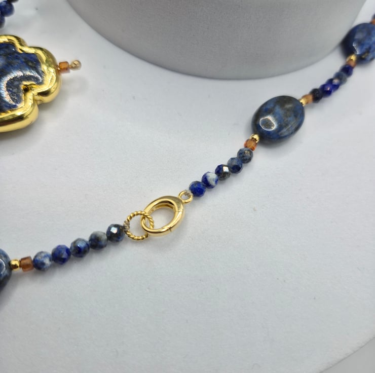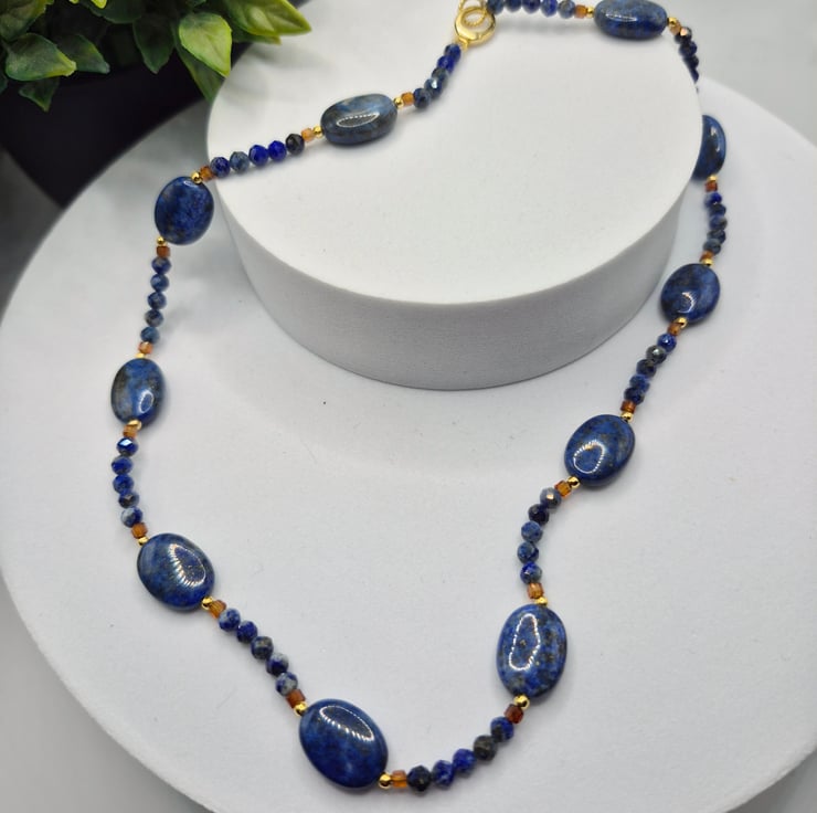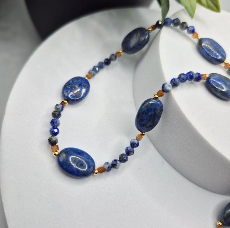 The necklace is strung with 4mm faceted natural lapis lazuli beads and 15 x 10mm oval natural lapis lazuli beads, both completely undyed and natural. These are complemented by natural faceted hessonite garnet cube beads and 2mm 9ct gold plated sterling silver beads, adding warmth and subtle sparkle. It fastens with a 9ct gold plated sterling silver clasp and textured jump ring for a refined finish.