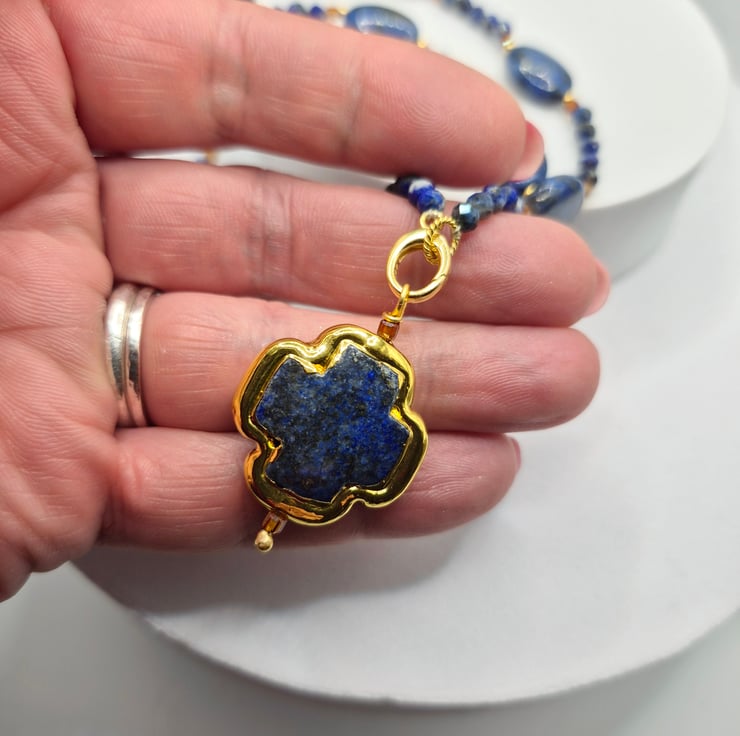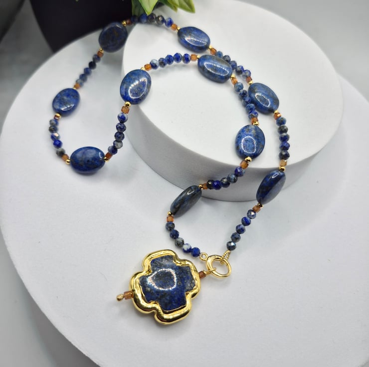 A rich royal blue necklace featuring natural, undyed lapis lazuli paired with warm hessonite garnet and gold accents. This 42cm piece is designed to be worn two ways, either as a simple beaded necklace or with the detachable lapis cross pendant for a more striking look, making it beautifully versatile for both everyday wear and special occasions.