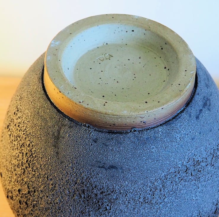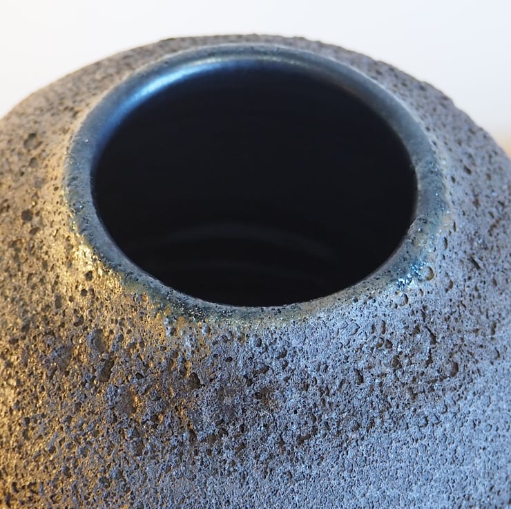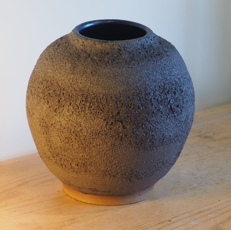 Stoneware pottery moon vase or jar. Hand made and thrown on my potters wheel. Finished in a dark charcoal magma textured glaze.