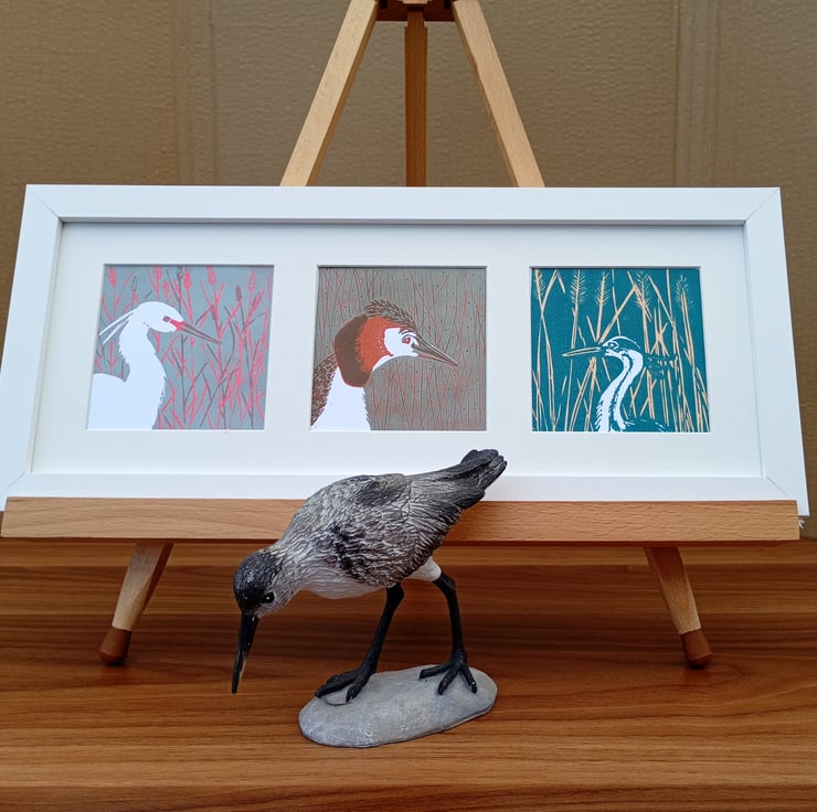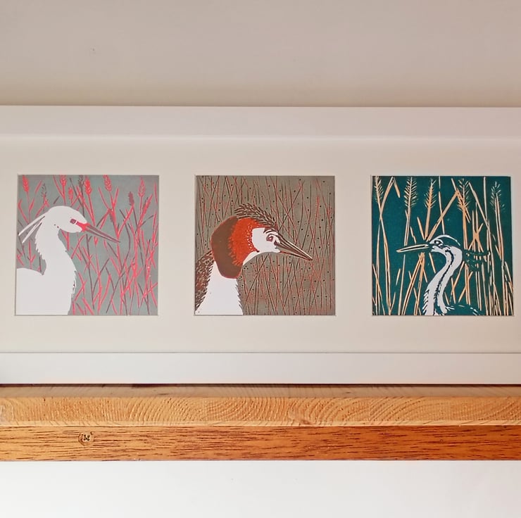 The vibrant colours of an egret, a heron and a great crested grebe in all his spring glory, framed as a group, would look good in both traditional and modern homes.