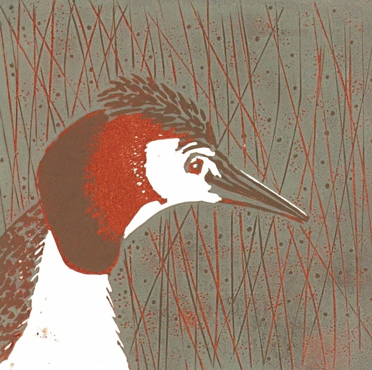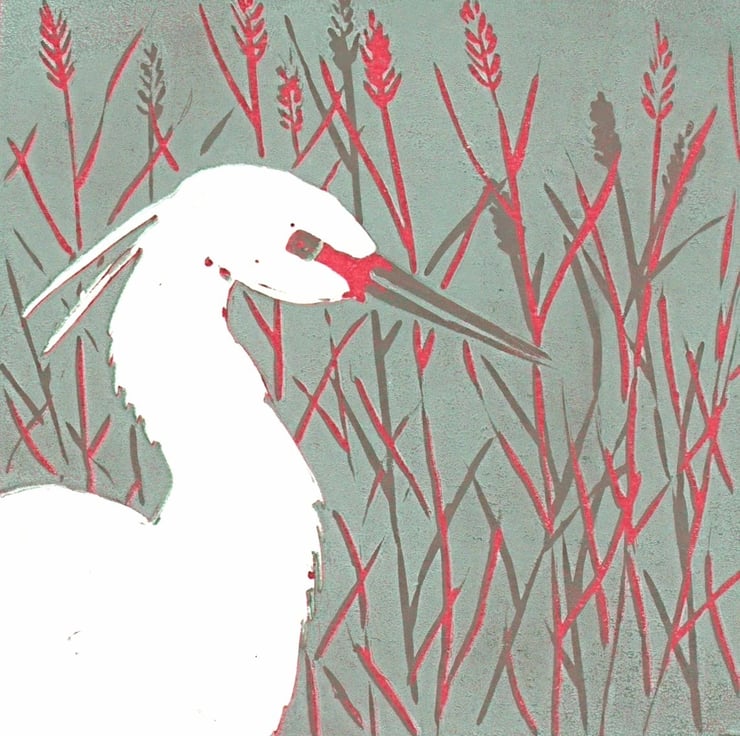 Living in rural Somerset, I often visit the levels where these beautiful birds live. The egret is now a regular sight, alongside the herons and grebes. I enjoyed creating these linoprints, using the reduction method. This means as I print each colour, I carve away more and more of the lino, until there is very little left. Once an edition has been printed, I can never repeat it, although I do sometimes take a copy of the image to reproduce digitally.