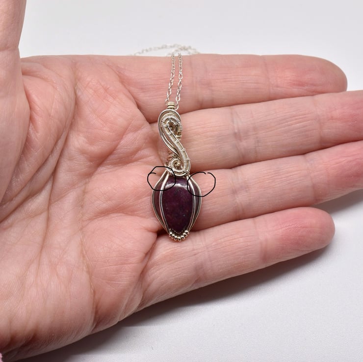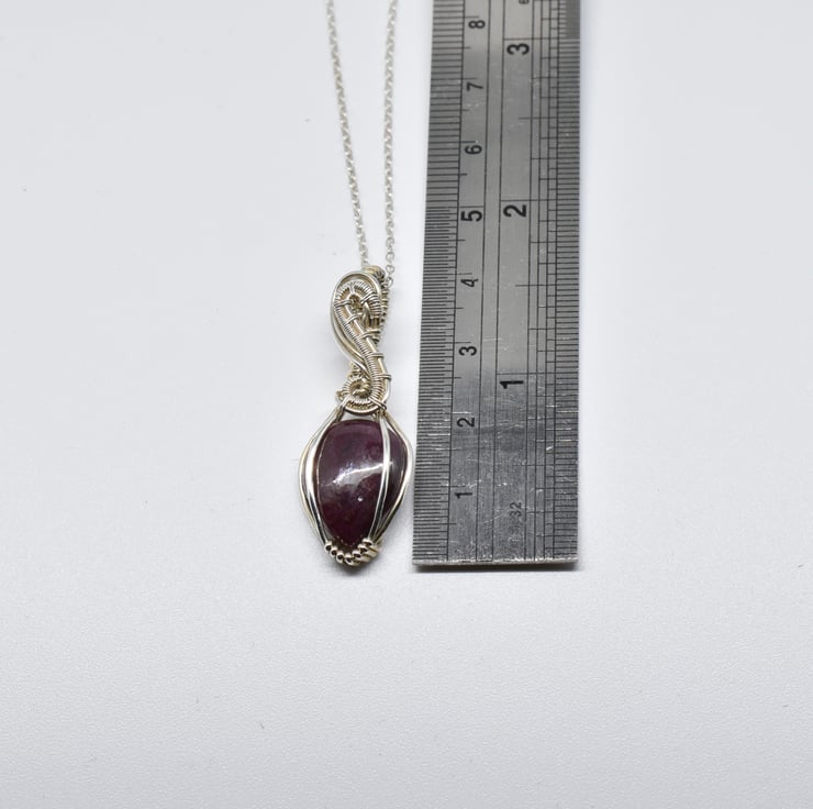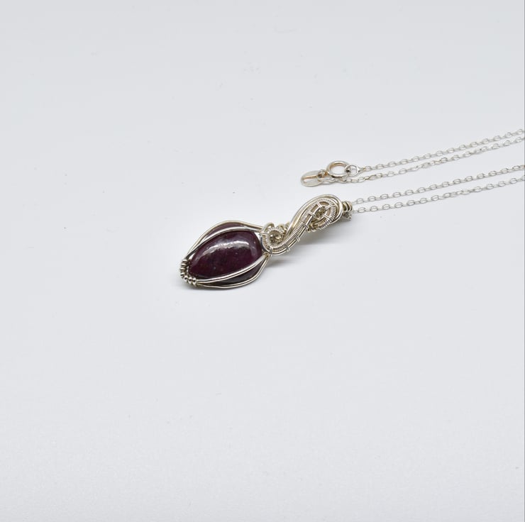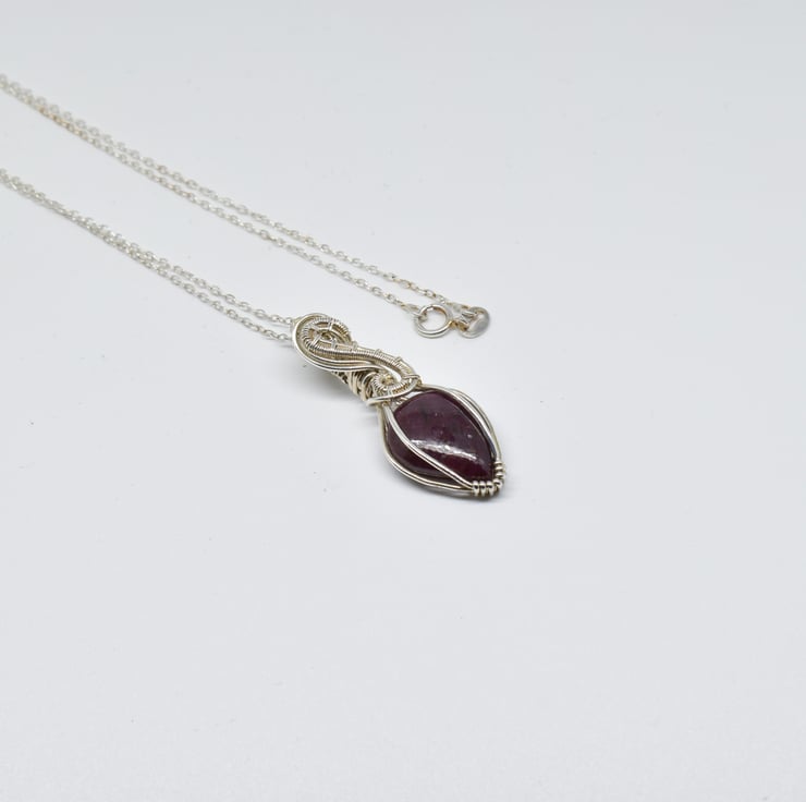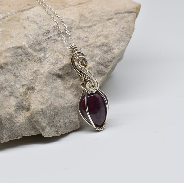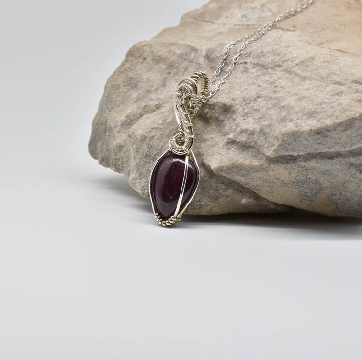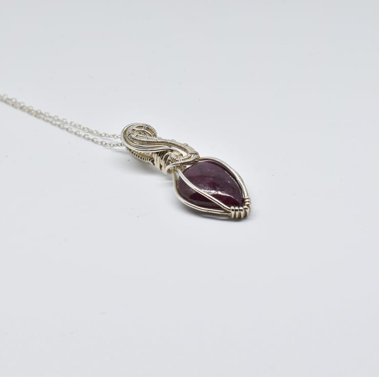 This dainty little ruby pendant is wire wrapped and woven using sterling and fine silver wires.