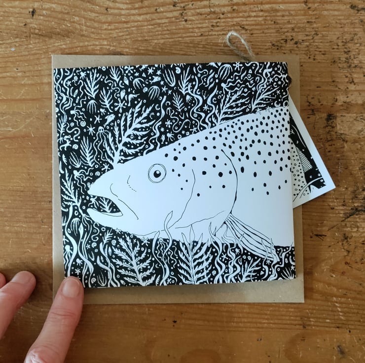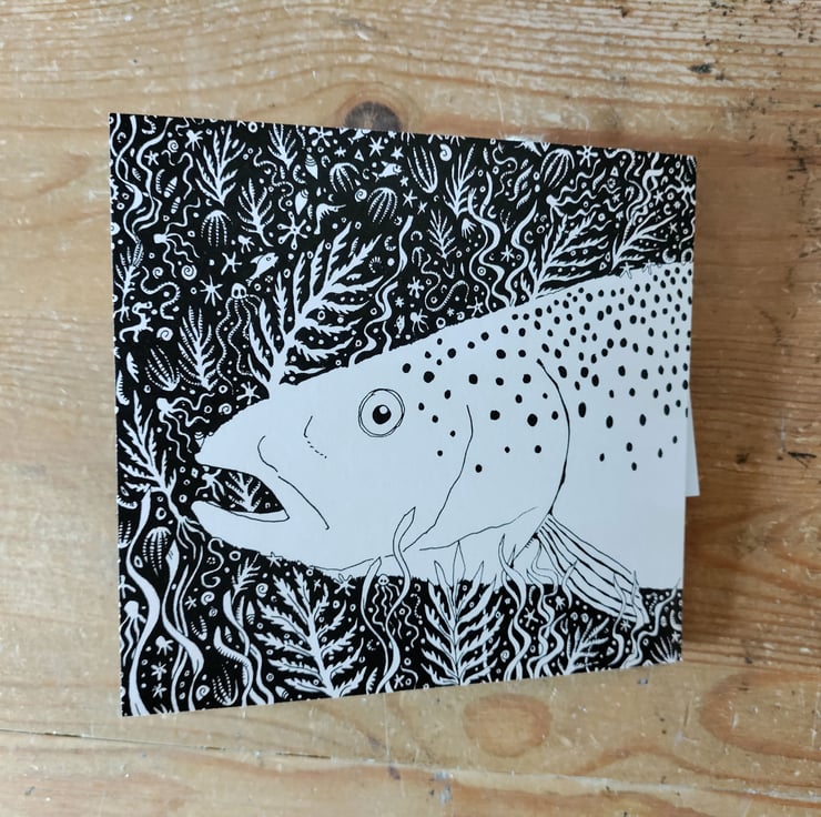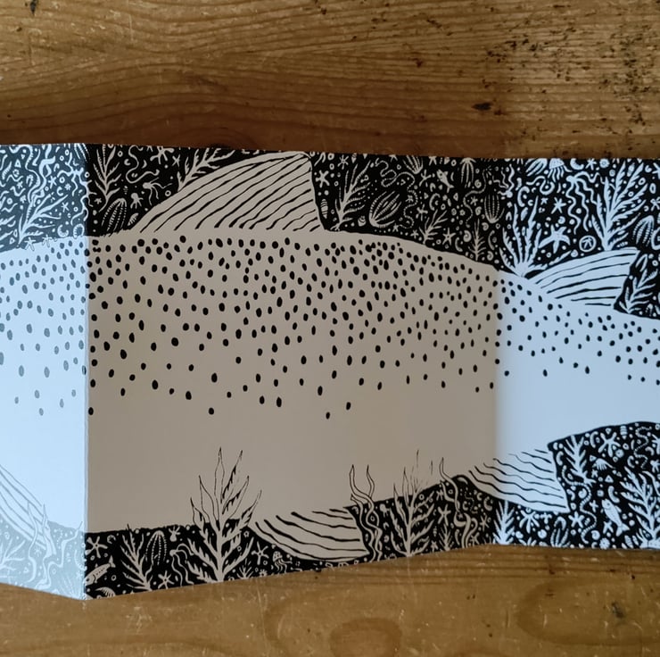 Sea Trout is a long card folded in a concertina way that is illustrated on both sides with detailed pen and ink illustrations. This is 'perfectly imperfect' because it is printed on lighter weight card stock than I usually use, making it a gram or two lighter.