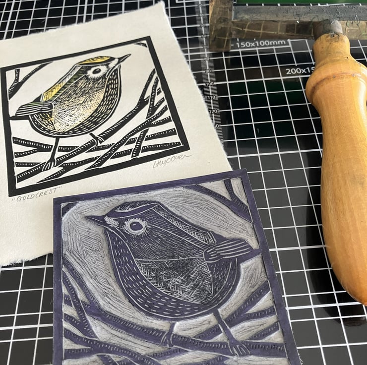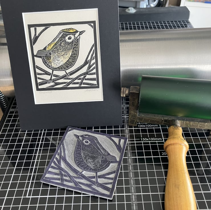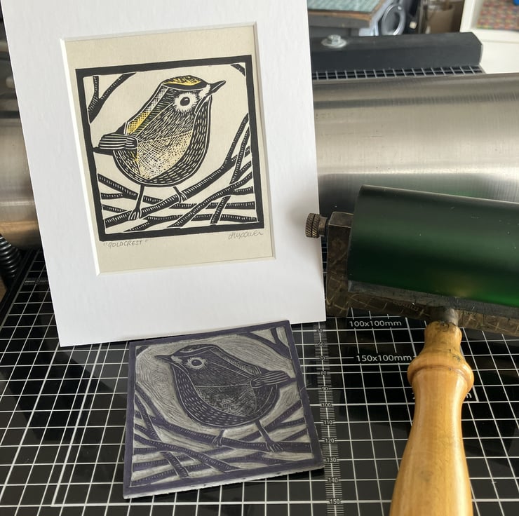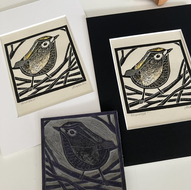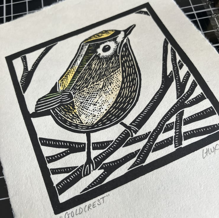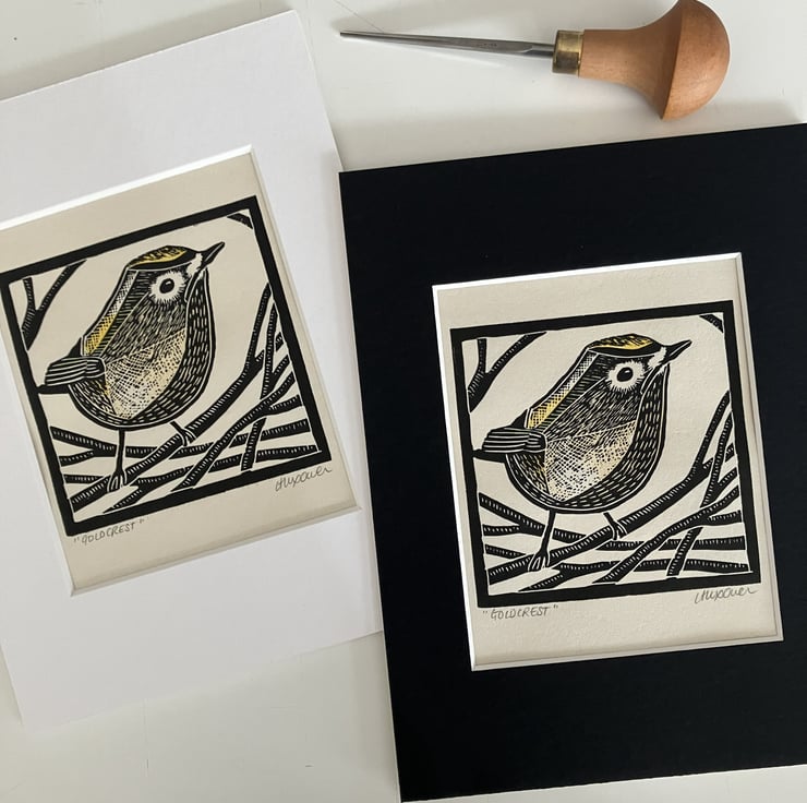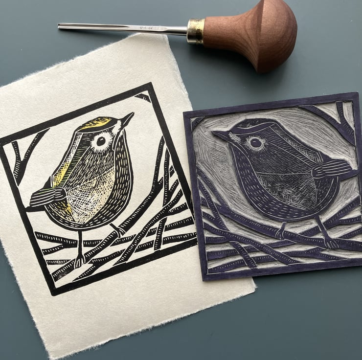 Goldcrest is created using the relief printmaking method of linocut printing. As each print is created by hand there may be tiny variations which add to the individual beauty of each original artwork. Goldcrest is printed onto Okawara Pro Roll 70gsm printmaking paper from Awagami Factory using archival quality ink. The print is then hand coloured with watercolour.