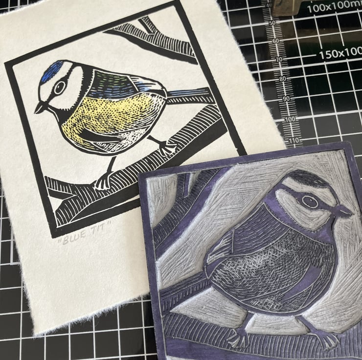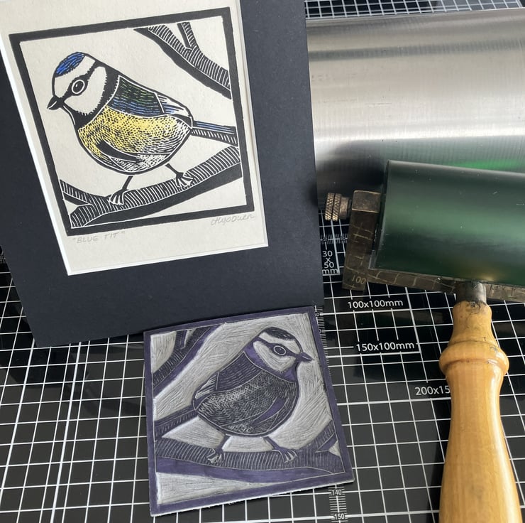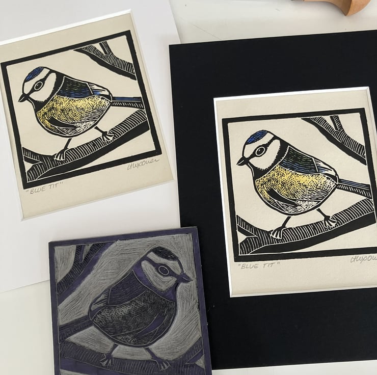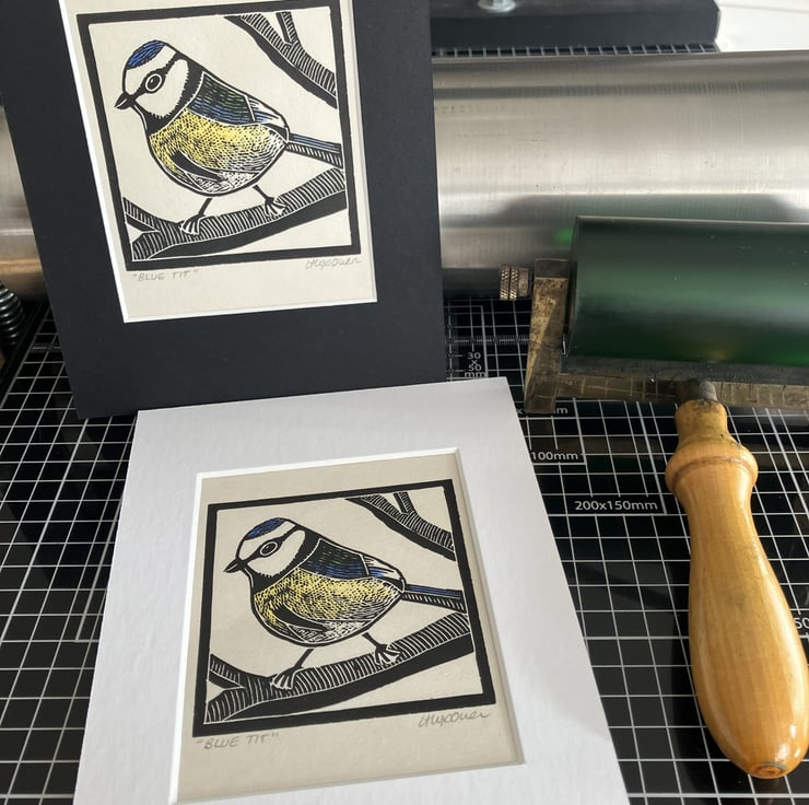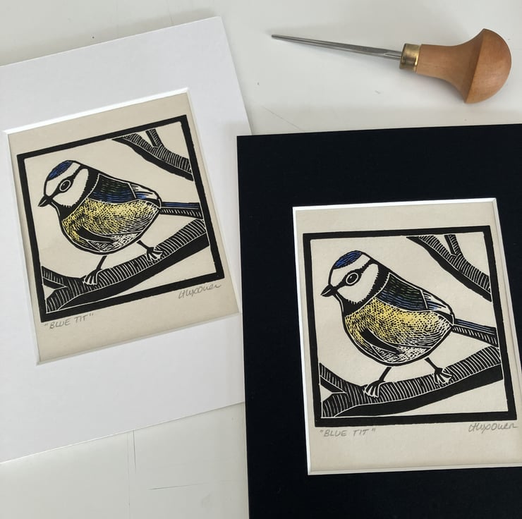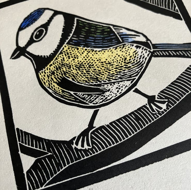 "Blue Tit" is created using the relief printmaking method of linocut printing. As each print is created by hand there may be tiny variations which add to the individual beauty of each original artwork. "Blue Tit" is printed onto Okawara Pro Roll 70gsm printmaking paper from Awagami Factory using archival quality ink. The print is then hand coloured with watercolour.