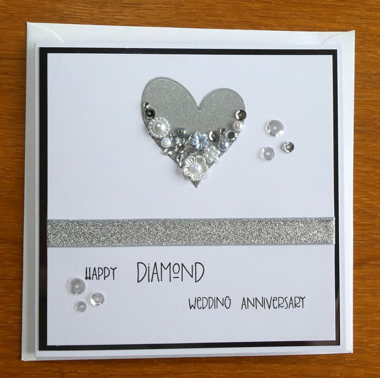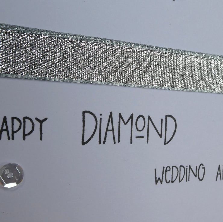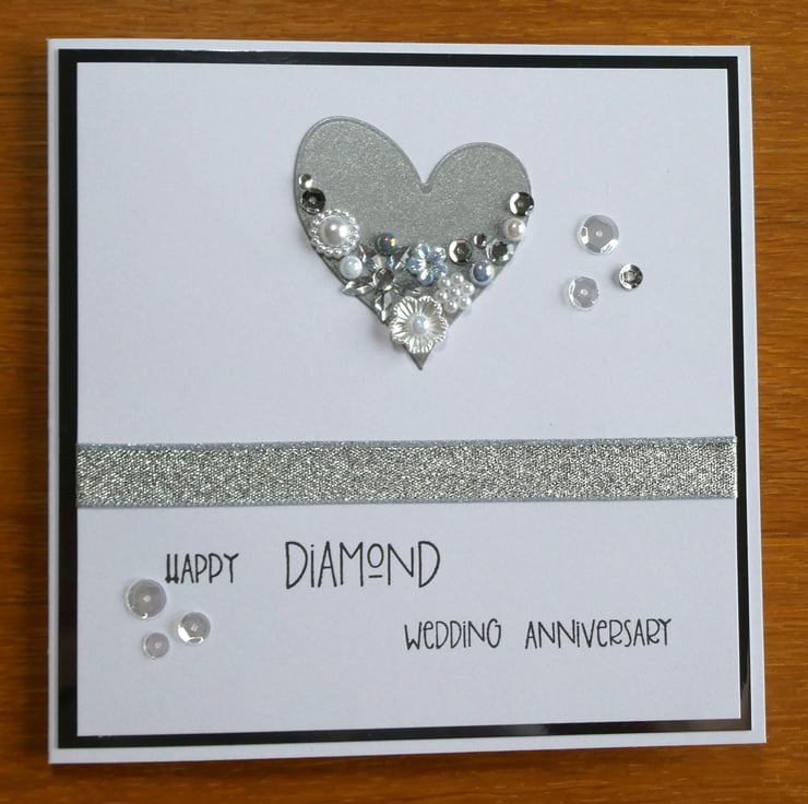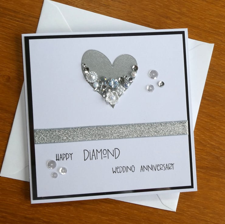 This elegant Diamond Wedding Anniversary card has a silver foiled embellished heart and silver ribbon and is perfect to send to someone celebrating their 60th Wedding Anniversary.