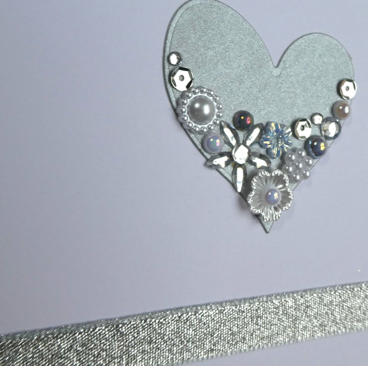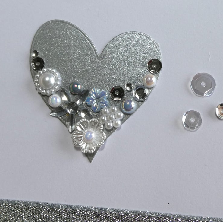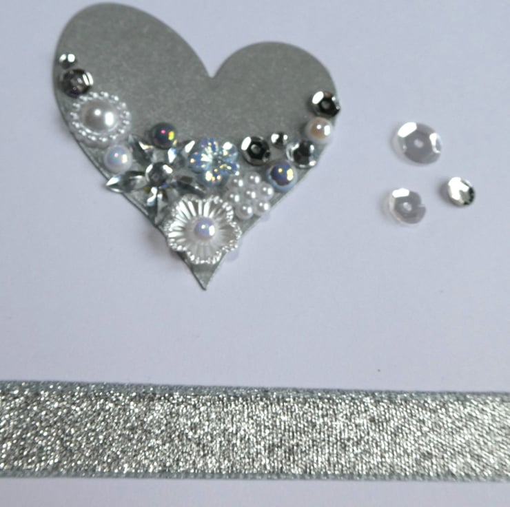 An embossed silver foiled heart has been die cut and embellished with sequins, faux pearls and flower beads in shades of white, silver and grey. It has been attached to bright white background card above a band of silver textured ribbon.