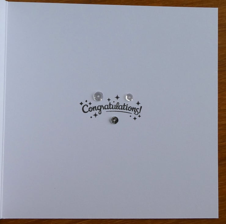 The message Congratulations surrounded with stars has been hand stamped on the inside, highlighted with more sequins, leaving space for your own message.