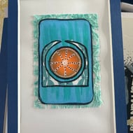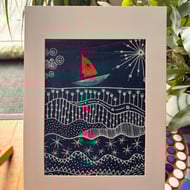 Little red boat on the waves collage art using handmade papers with acrylic picture 5 x 7 and mounted. A fun and colourful gift to brighten up the day.