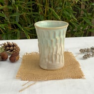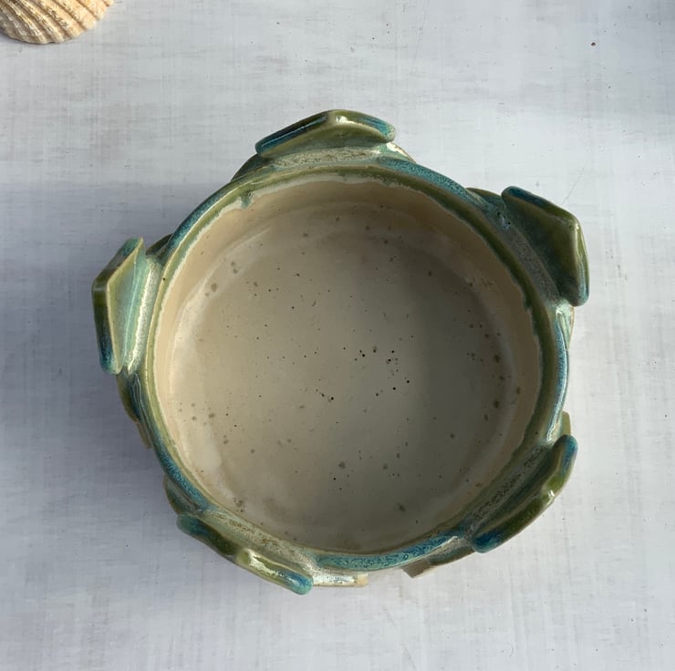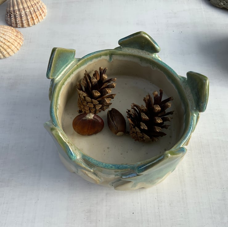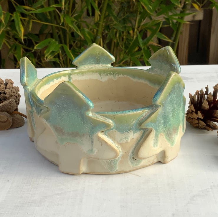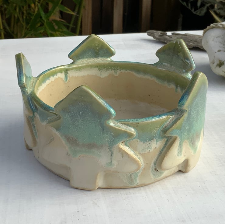 Bring a touch of charm to your home with this large hand thrown centrepiece candle holder. Lovingly crafted on the wheel using stoneware clay and finished with Aurora Green & Sea Salt glazes. The piece is embellished with 5 hand cut trees, applied around the body. A larger candle can be used, casting a more powerful glow of candlelight than traditional tealights, filling your space with warmth and calm.