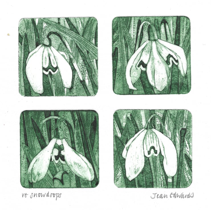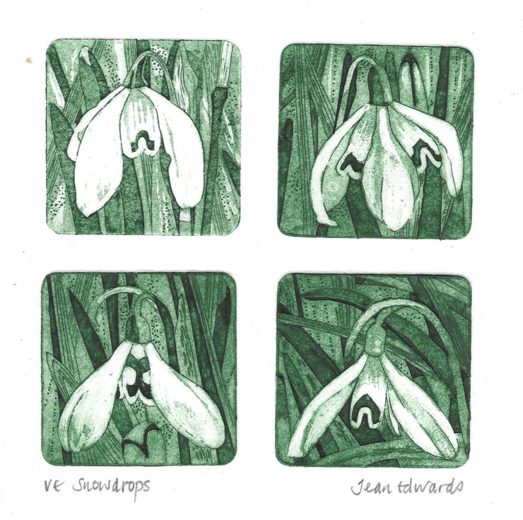 I have been sketching individual snowdrops in detail lately. I've made six small tiles do far and I've been printing them in groups of four. There are two configurations listed here.