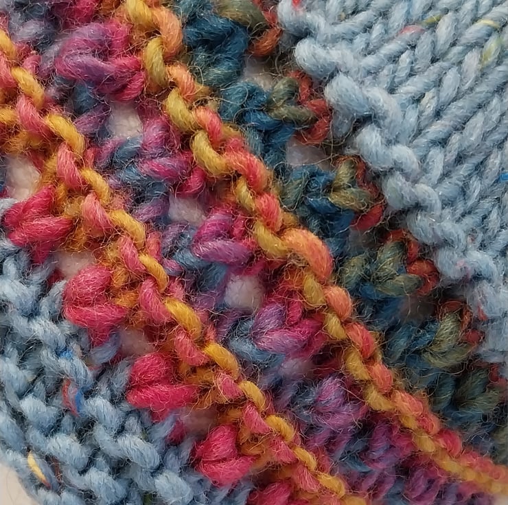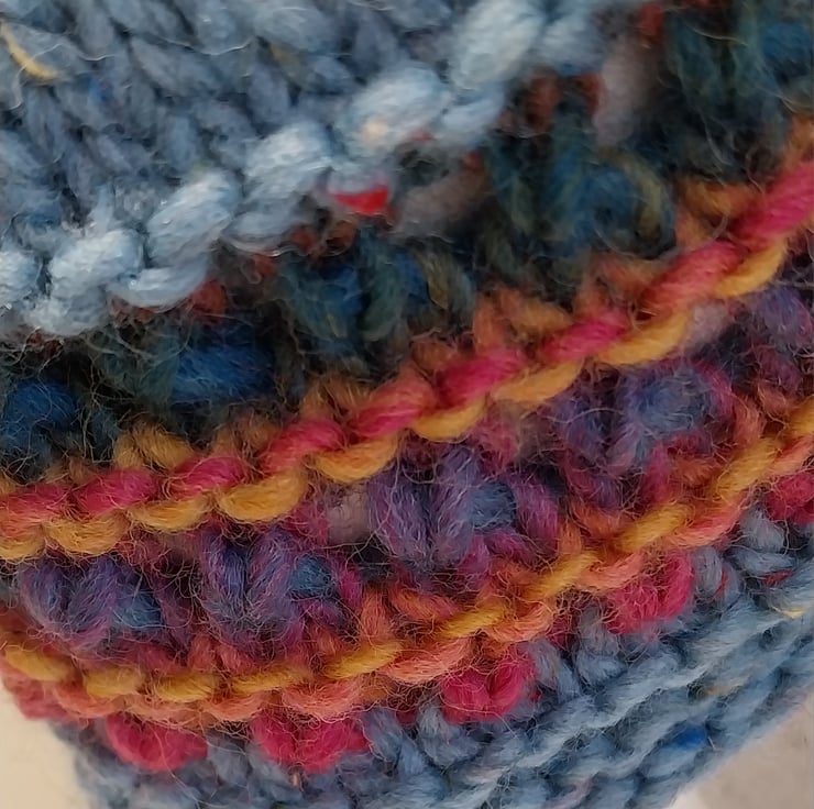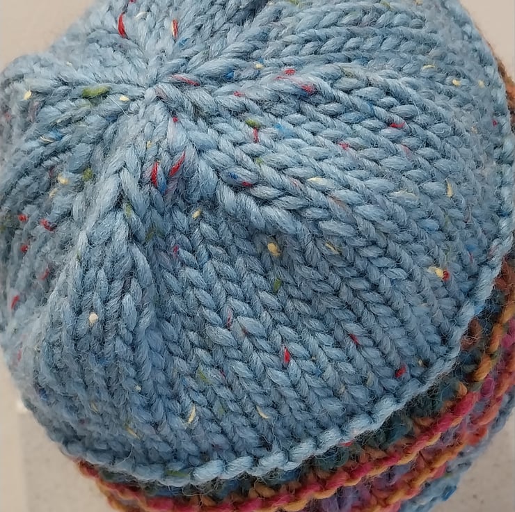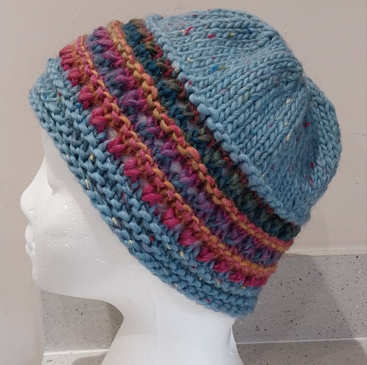 This hat is made from a gorgeous, soft, tweedy, chunky merino from Sublime and a multicoloured 100% Wool contrast.
