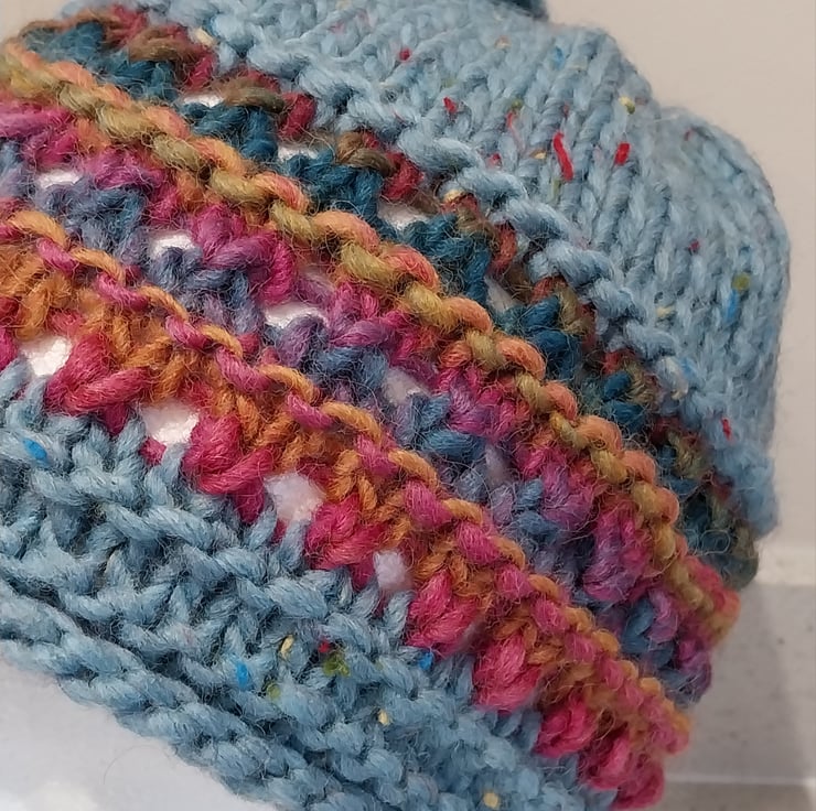 This hat incorporates an eyelet pattern design and the hat is a plain colour with bright rainbow colourwave as a decorative band.