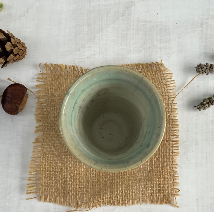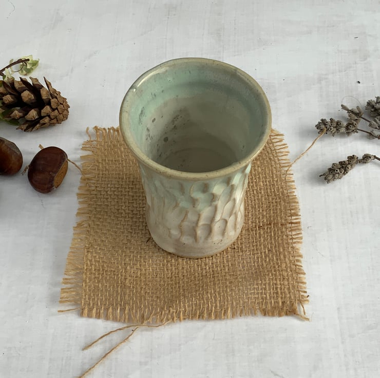A small keeper for everyday rituals. This handmade ceramic holder is just the right size for toothbrushes, makeup brushes, or whatever bits and bobs like to gather by the sink. Thrown on the wheel, then embellished and glazed by hand, no two are exactly alike, making each piece a one-of-a-kind companion for your daily routines. Finished in speckled Winter Wood and Aurora Green glazes.