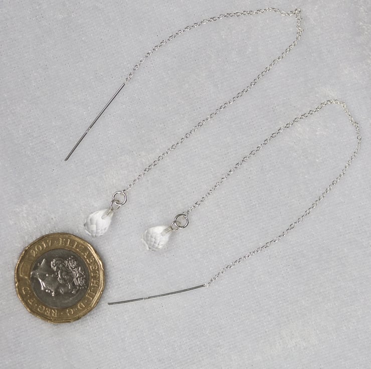 The crystal dropper is about 9mm long and 6mm wide. The entire length of each earring is 16.5cms (6.5ins). They can be pulled through the ear to a length of your choosing, with a minimum length of around 8cms (3 ins).