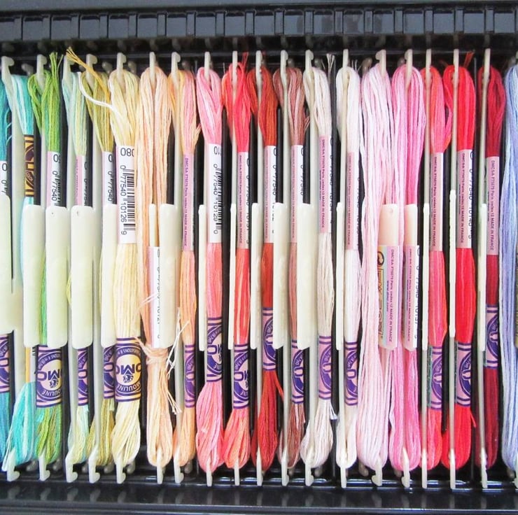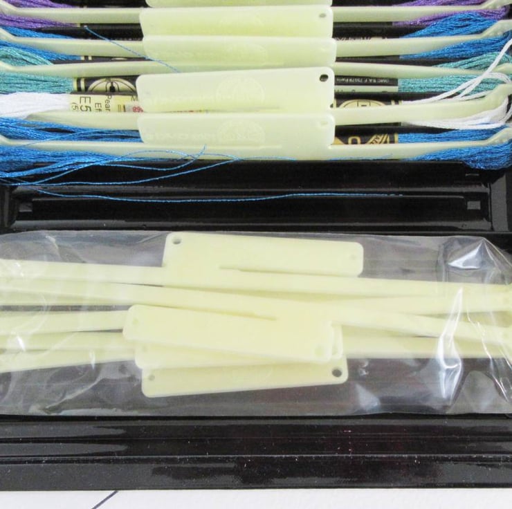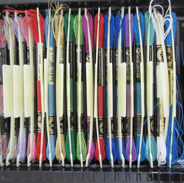 The DMC thread box includes the 'stitchbow' organisers designed to hold the skeins in place. There is also a set of 465 sticky labels to help organise all your skeins and a handy booklet with lots of handy tips and listings of DMC thread types.