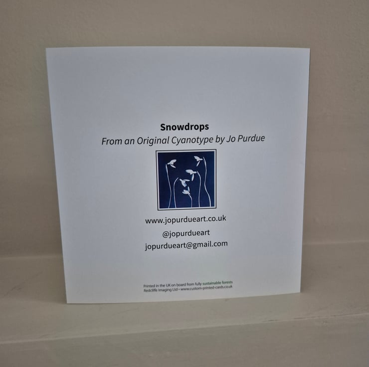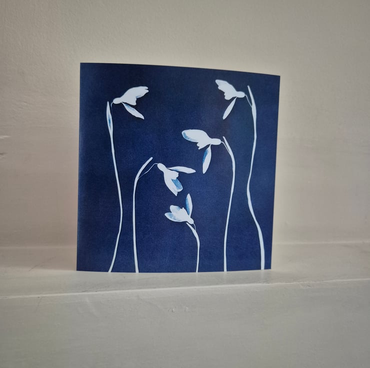 This greeting card was reproduced from one of my original cyanotype prints, created using Snowdrops picked from my garden.