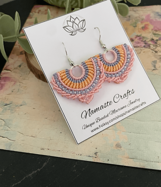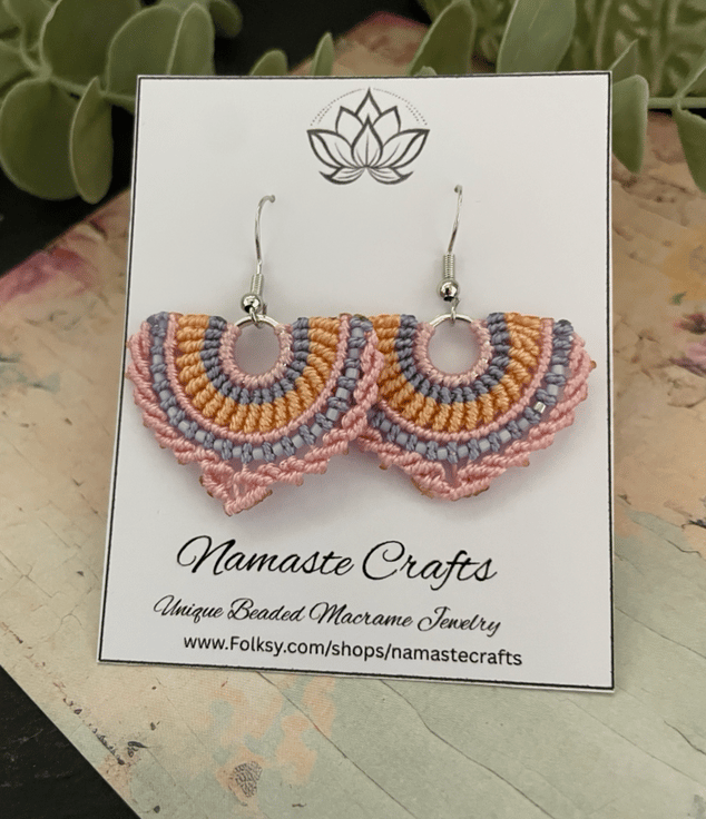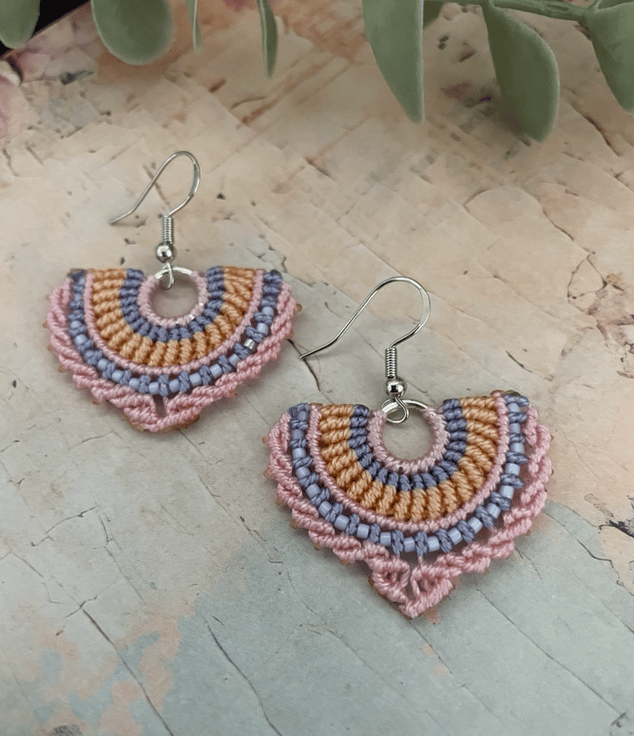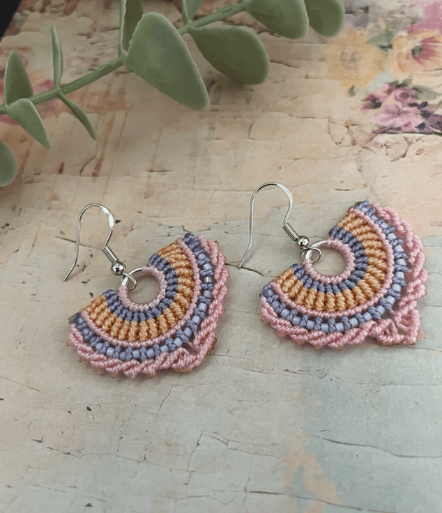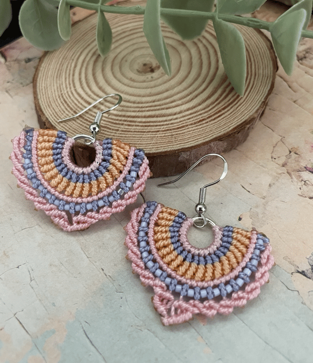 Designed and created by me in my Kent studio in pretty colours of peach blue and pink interwoven with tiny glass seed beads and using unbreakable c-lon macrame thread which makes them very light weight but makes a big statement .