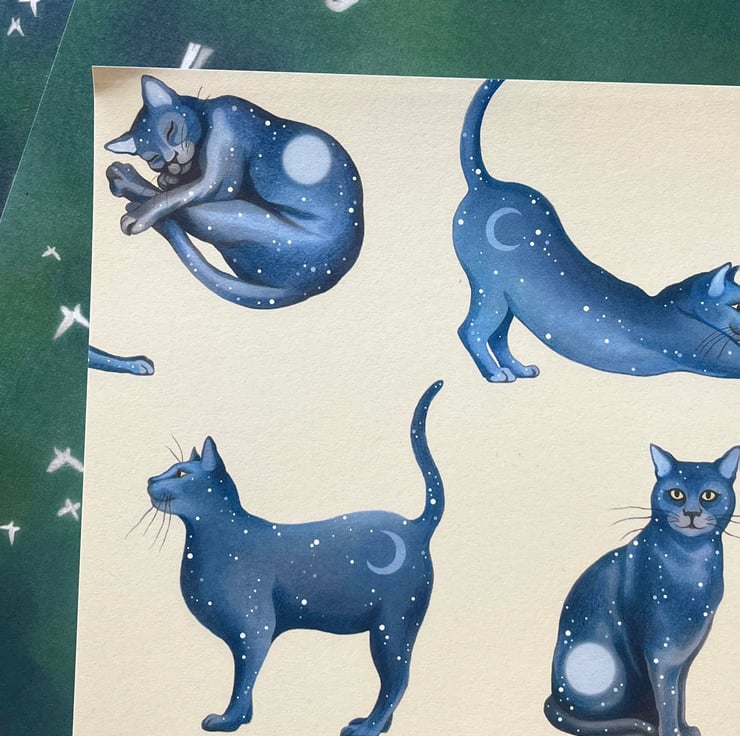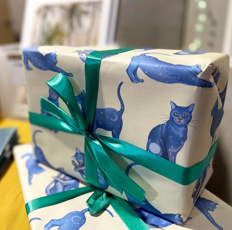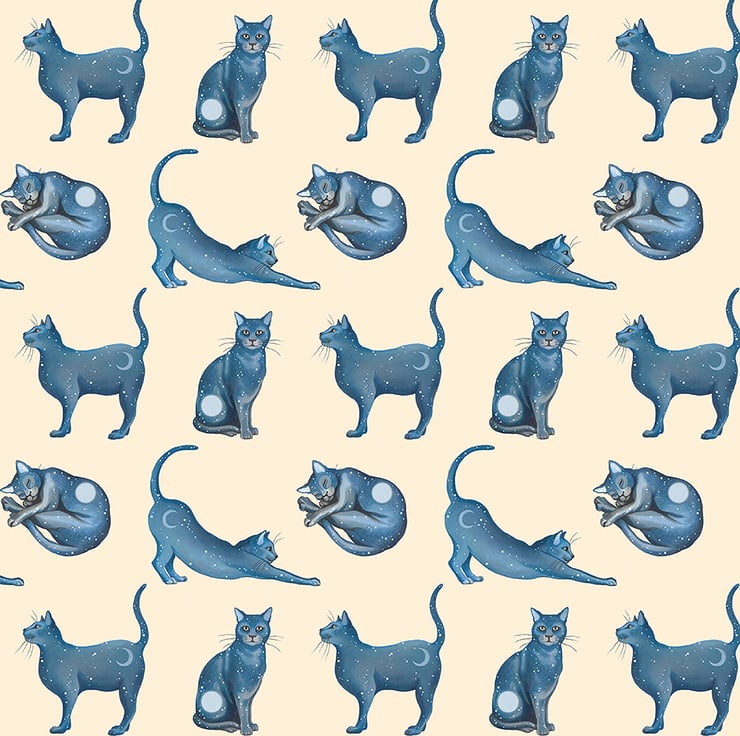 I created this elegant "Lunar Cats" gift wrap using a combination of chalk pastel, coloured pencil and digital illustration to bring it all together as a pattern!