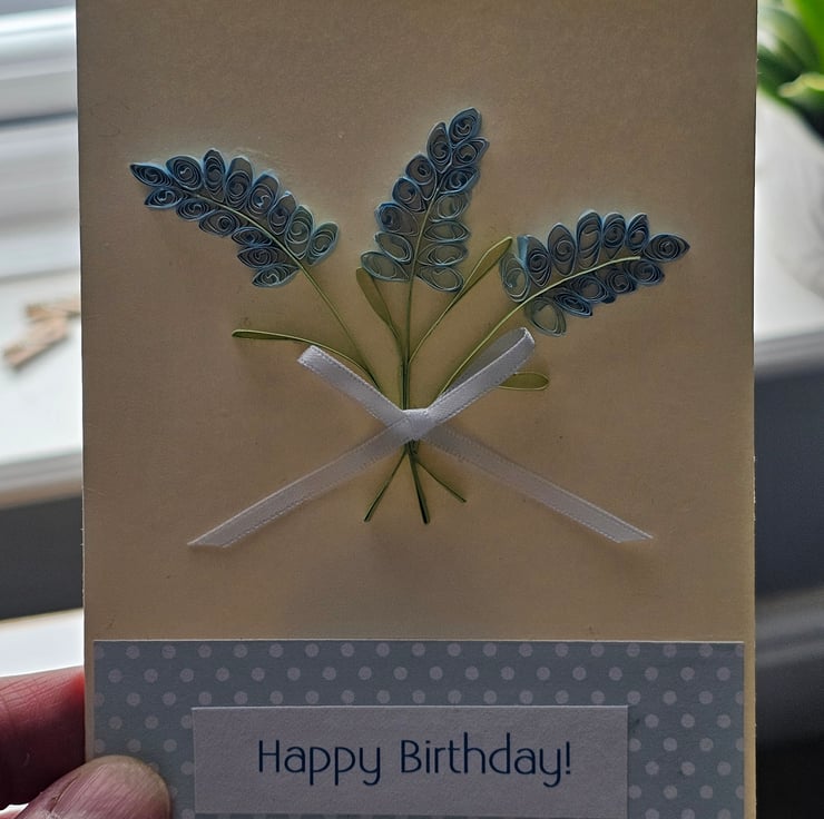 This card is in the seconds sale because it is not as perfect as i would have liked. I have used two tones of pale blue for the flowers and the quilling is not up to my usual high standard. It is still a unique handmade card which would make someone happy on their birthday!