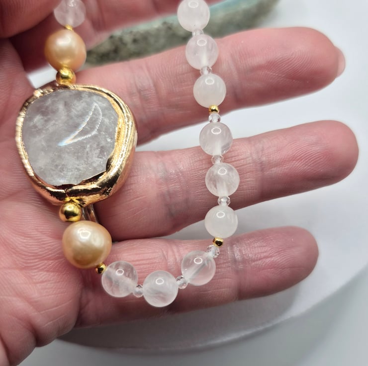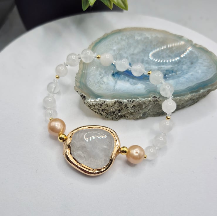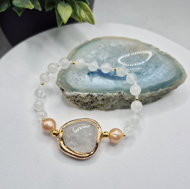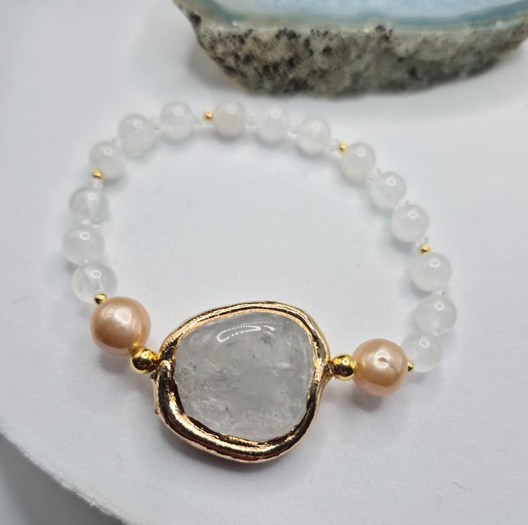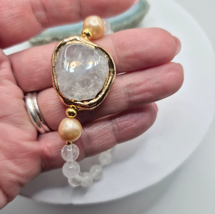 The centrepiece features a beautiful clear quartz gemstone with gold plated edging, framed by 8–9mm natural colour nucleated pearls. The bracelet is hand-strung with 6mm round clear quartz beads and finished with 2mm gold on sterling silver accent beads for a subtle touch of sparkle.