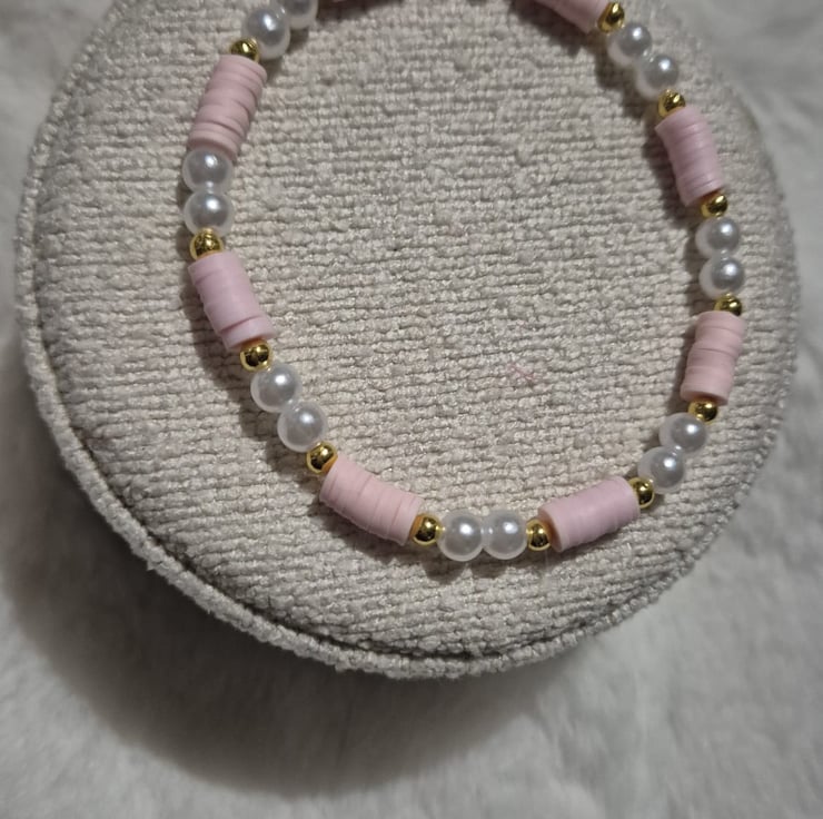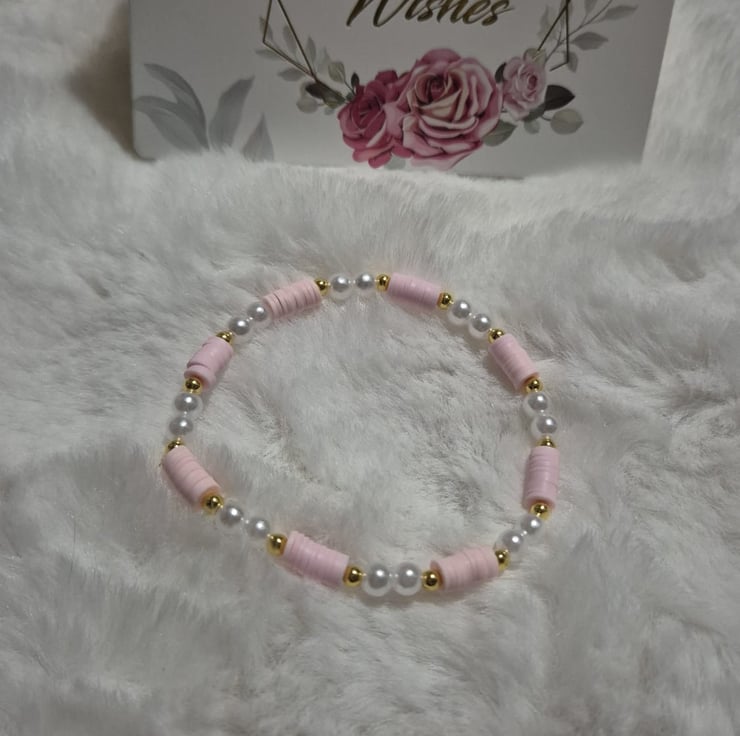 A handmade stretch bracelet featuring soft blush pink beads, classic white pearl-style beads and elegant gold accents. Designed to be lightweight and comfortable, this bracelet adds a delicate, feminine touch to any outfit.
