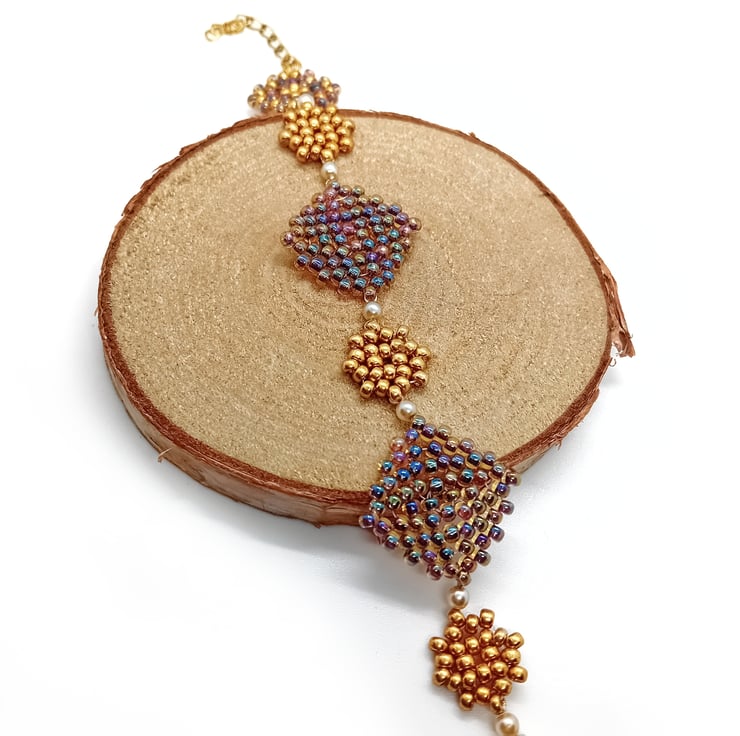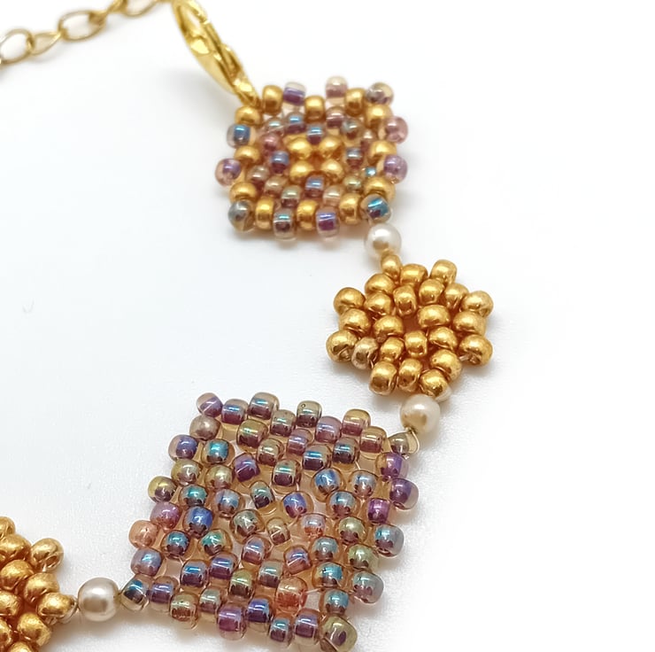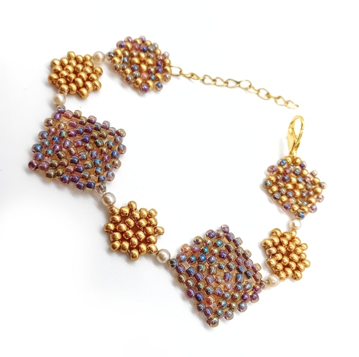 Gold and rainbow beaded granny squares bracelet. Lovingly made using peyote beading techniques.