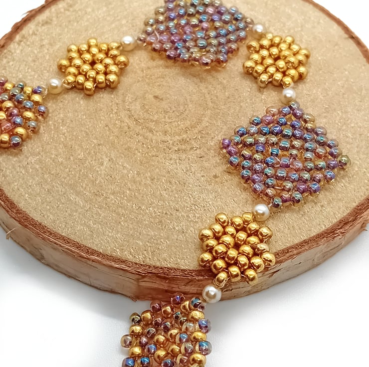 - Made using beading nylon, seed beads and gold plated findings.
