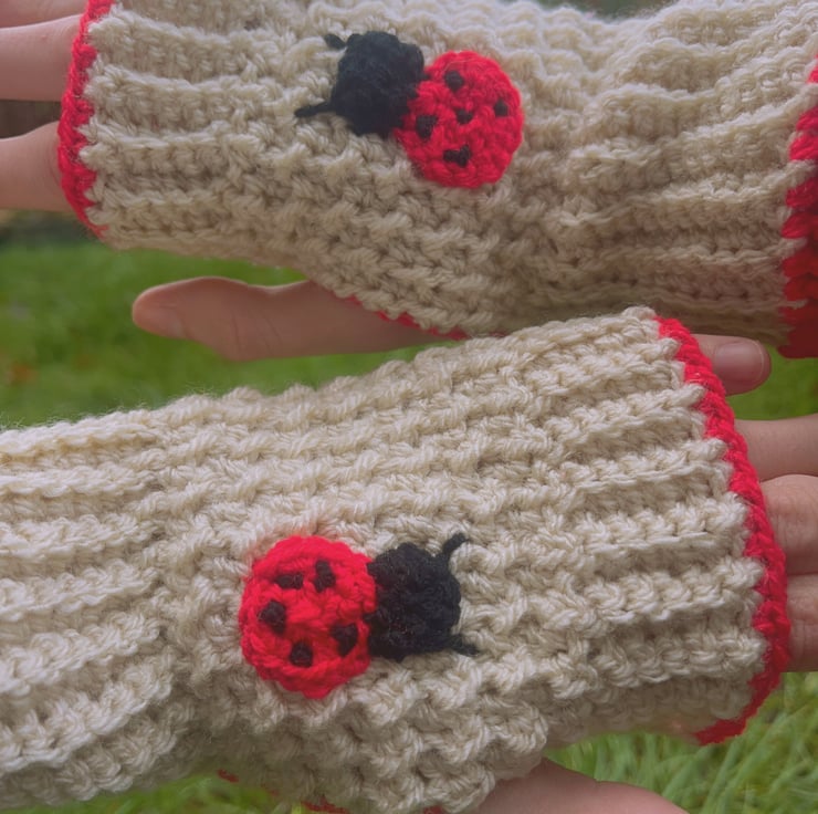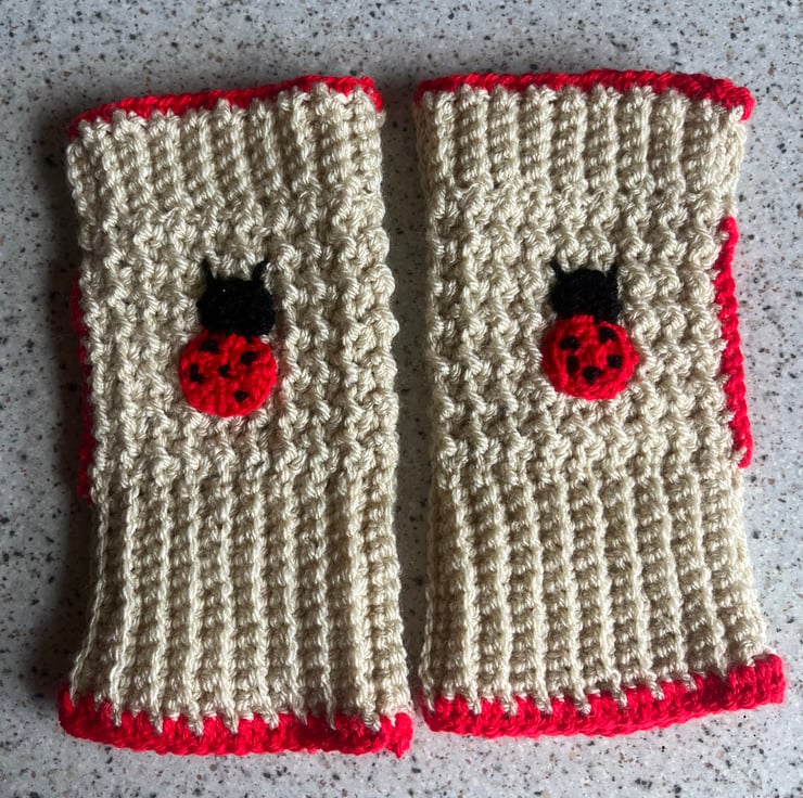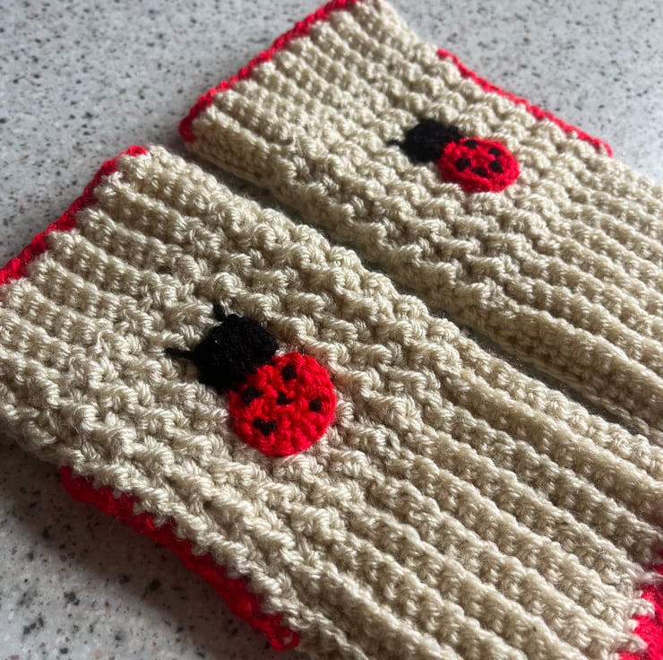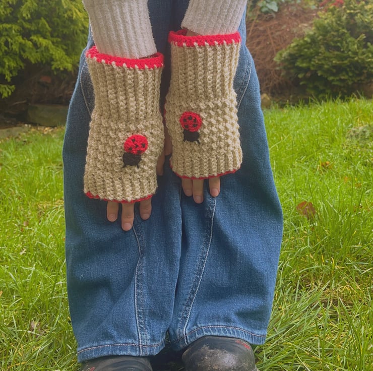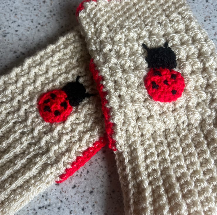 Ladybird Fingerless Gloves, Ladybug Crochet Design, Moss Stitch Wrist Warmer