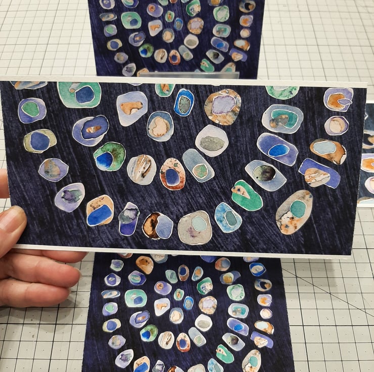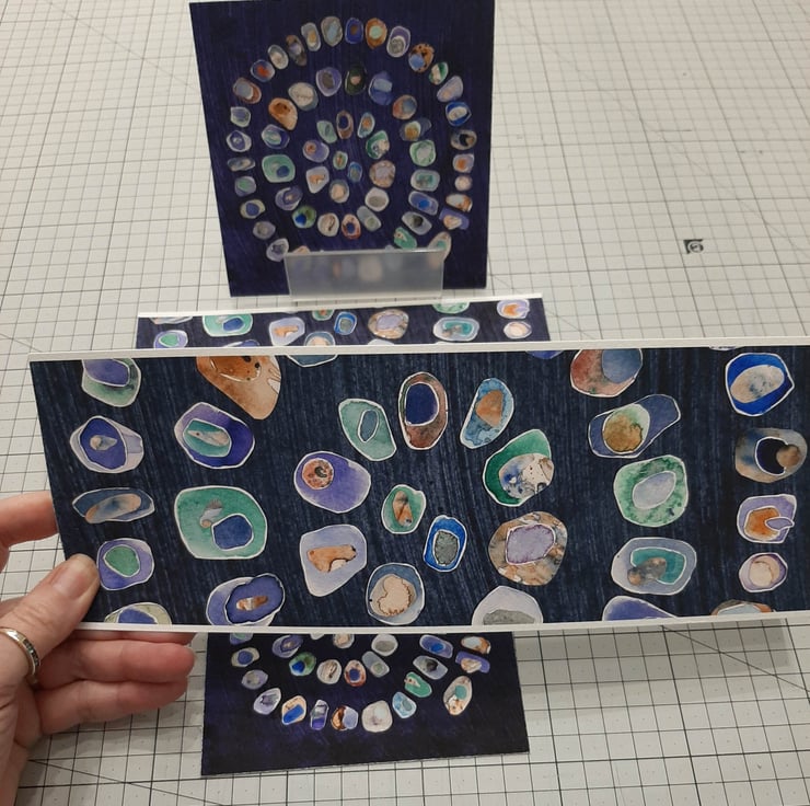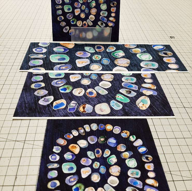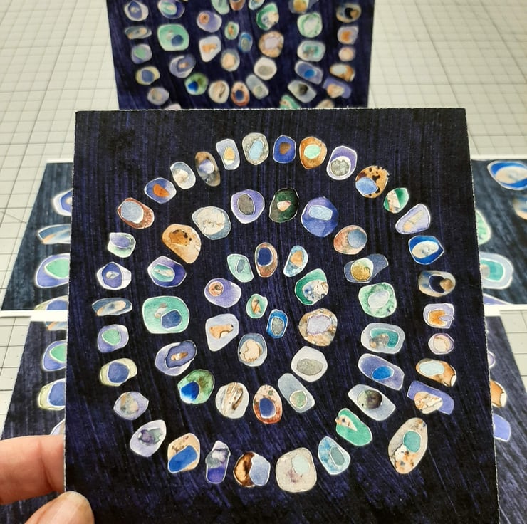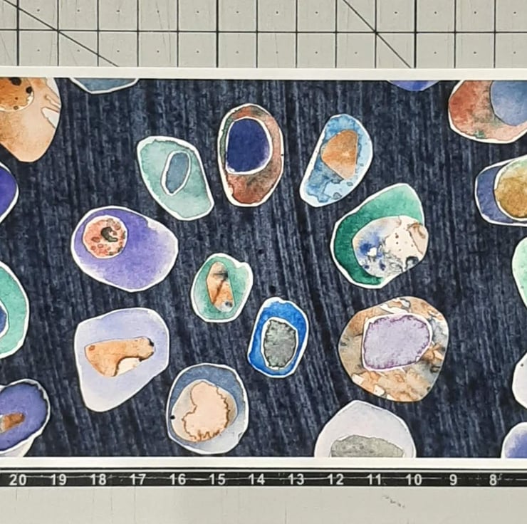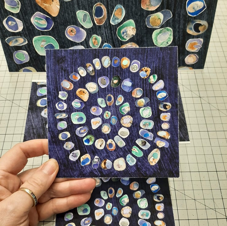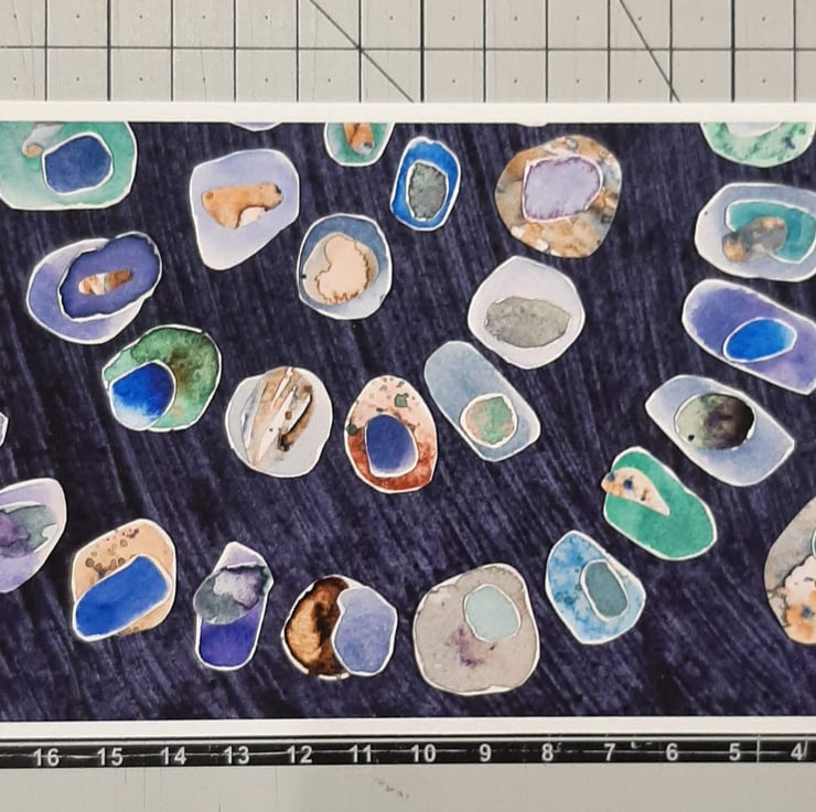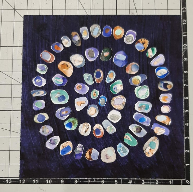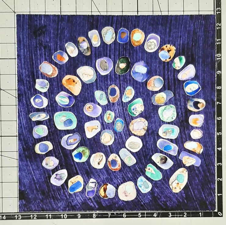 The original collage depicts a spiral of watercolour painted pebbles with colours representing sea-glass. Each pebble is layered with at least one or two smaller pebbles on top.