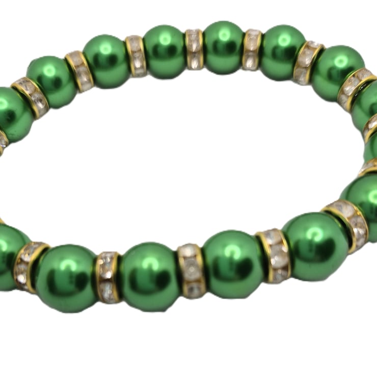 A stretchy bracelet made with green faux pearls alternated with gold coloured crystal rondelles