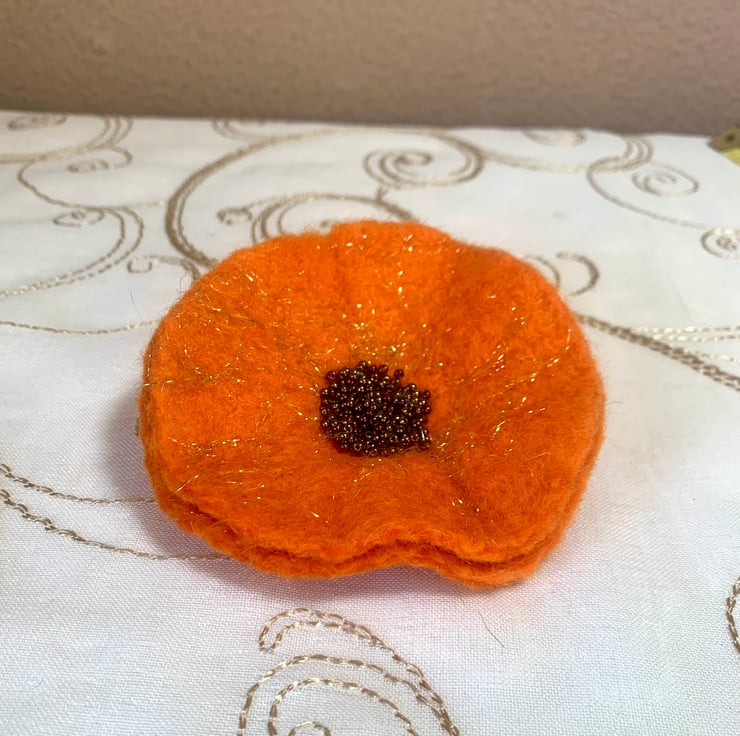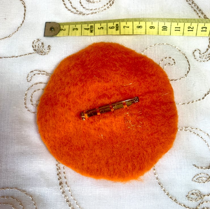 Hand felted orange brooch made from merino wool. This has been worked using traditional soap and water felting techniques. It contains variegated seed beads and is last season’s stock, hence inclusion in the sale!