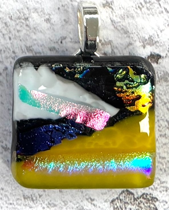 Each dichroic fused glass pendant comes complete with high quality 18" Silver plated bail and Silver plated chain.