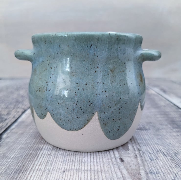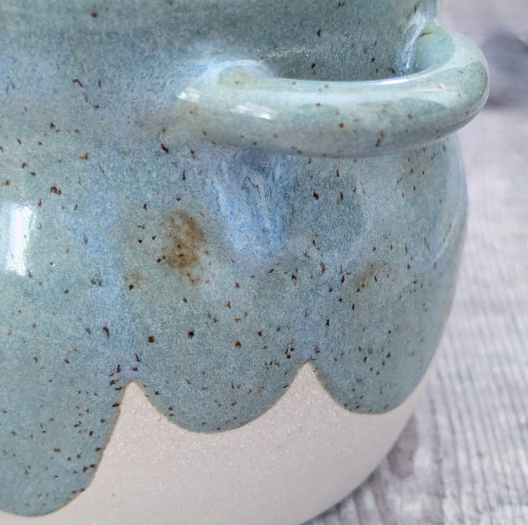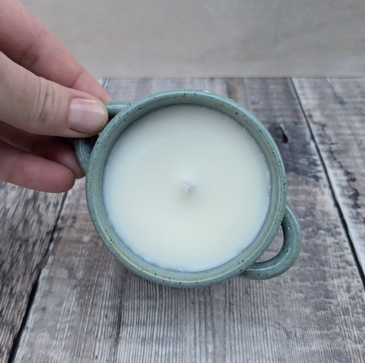 A wheel thrown pot in a white stoneware clay with two small handles in either side. The glaze is a speckled turquoise colour, with a hint of blue where thicker. It's filled with unscented soy wax and an eco wick. Once the candle is used and wick removed, the pot is fully reusable and dishwasher safe though hand washing is recommended.