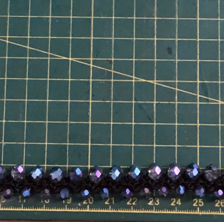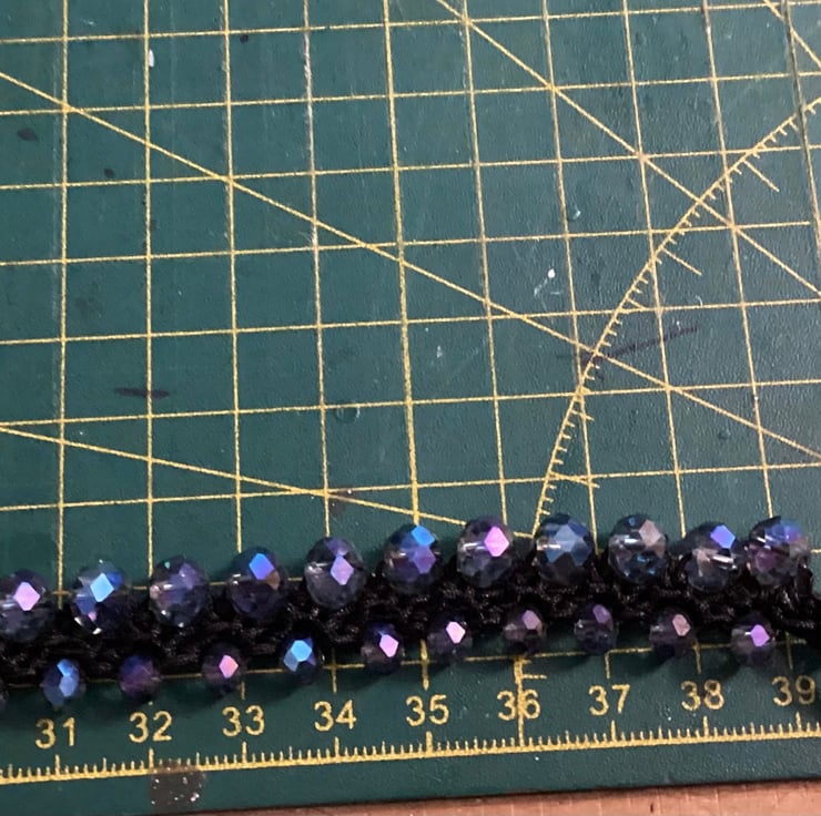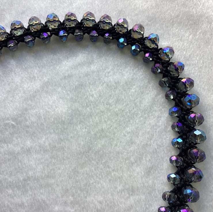 With black cord and glass beads .