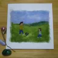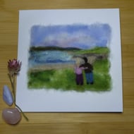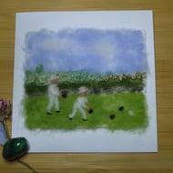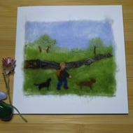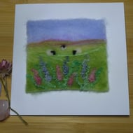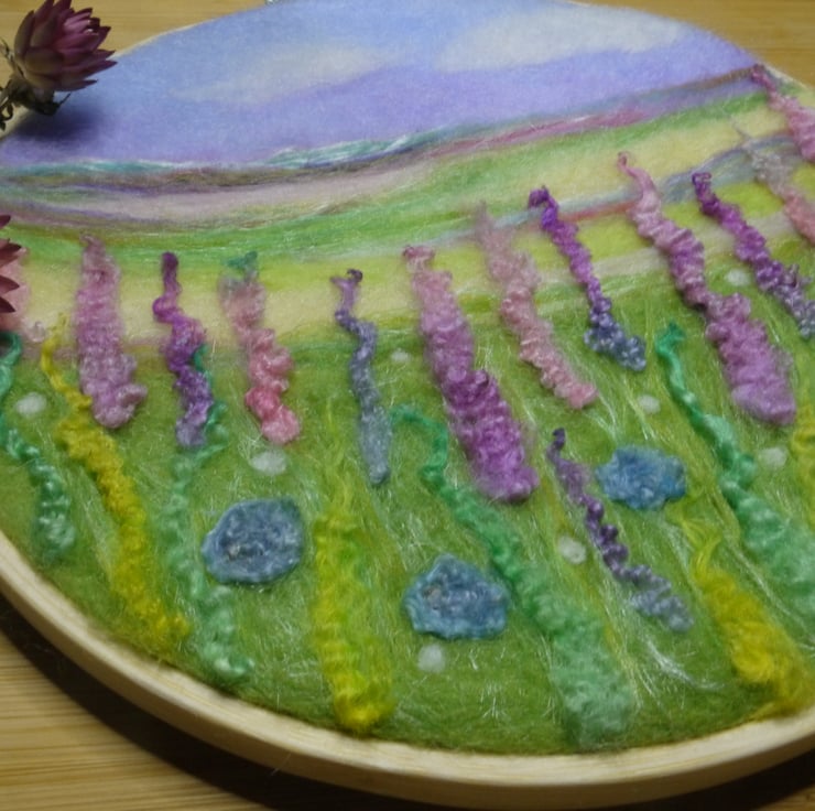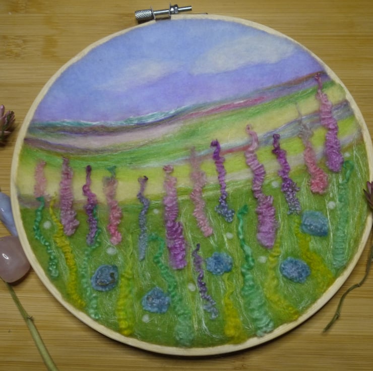 Handmade needle felted original artwork of a flower meadow in pastel hues, featuring a mix of felting wools and wool locks. This artwork is a unique piece and is in a 8 inch embroidery hoop.