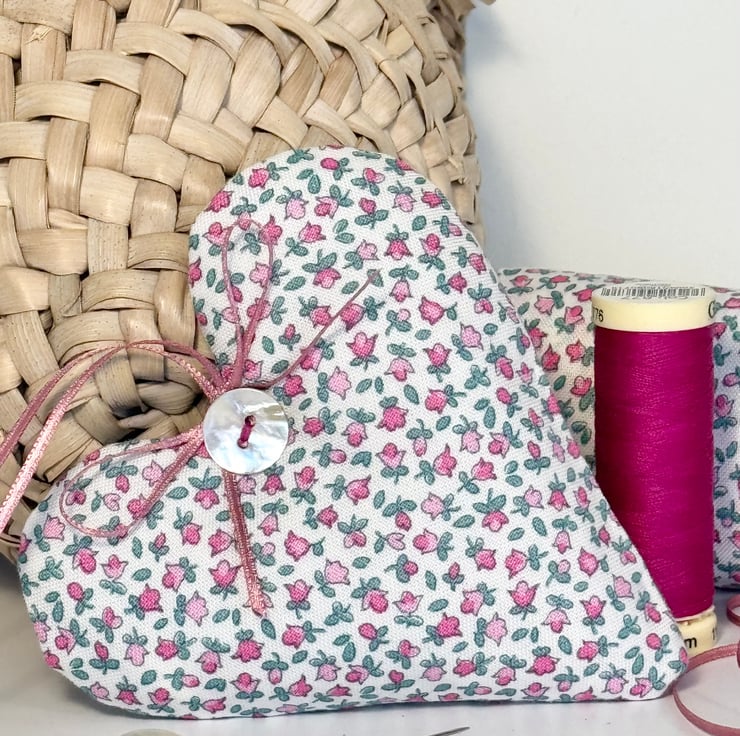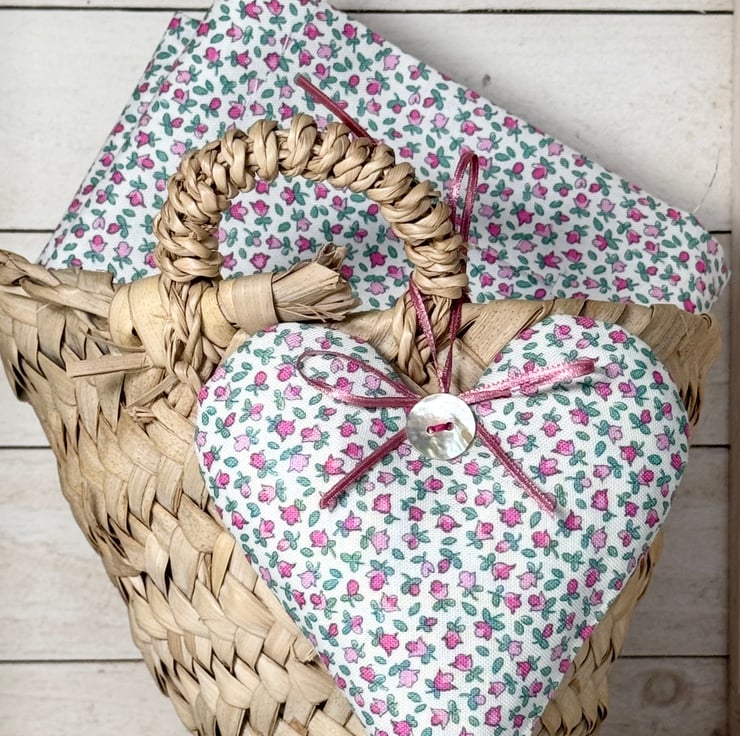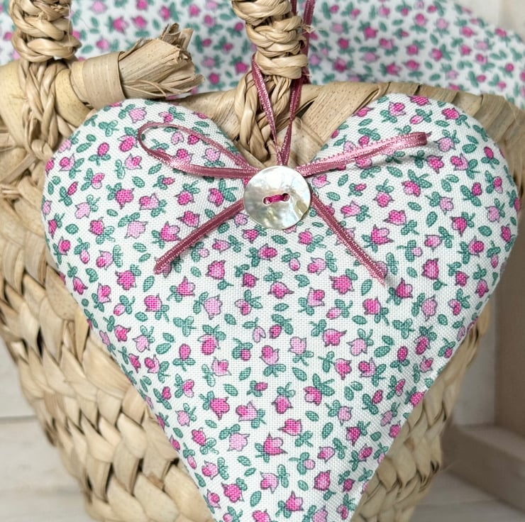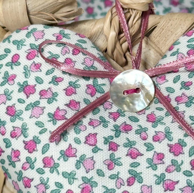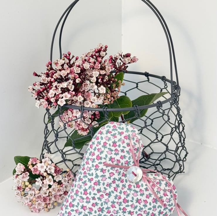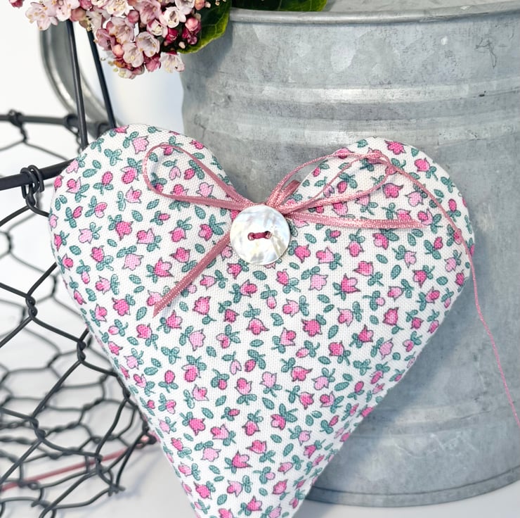 This exquisite fabric heart decoration is made in superb quality Liberty print heirloom Lasenby cotton and is generously filled with either fragrant Hampshire lavender or with hypoallergenic wool toy stuffing. Finished with a shimmery mother of pearl button and with delicate pink satin ribbon hanging ties and bow.
