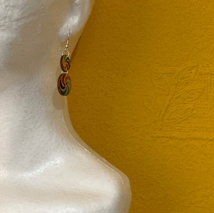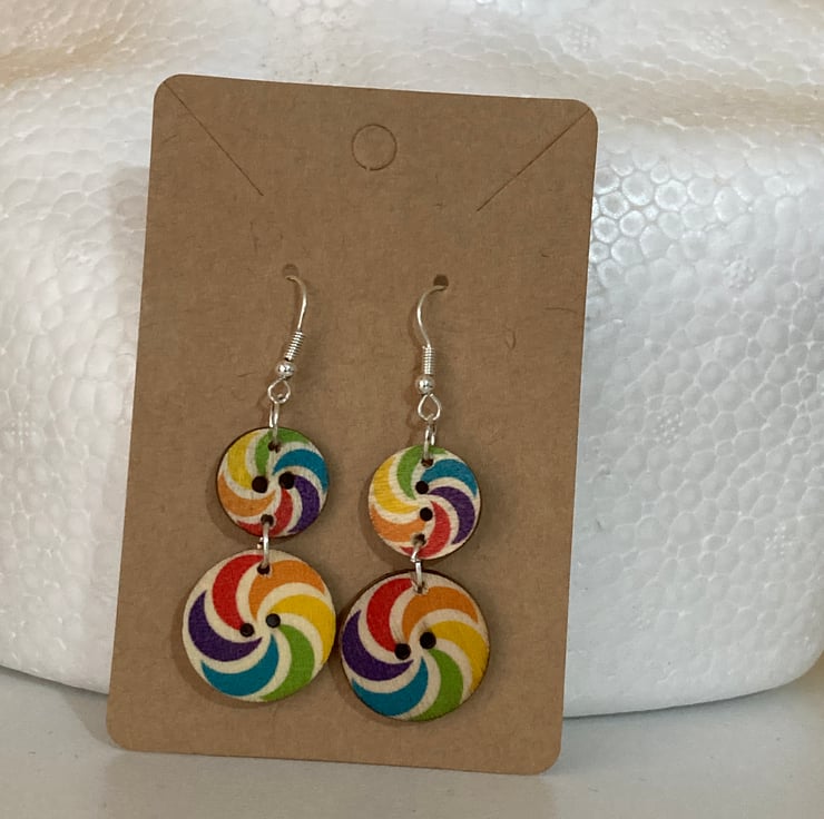 Wooden Button Earrings- Dangling Rainbow Swirls