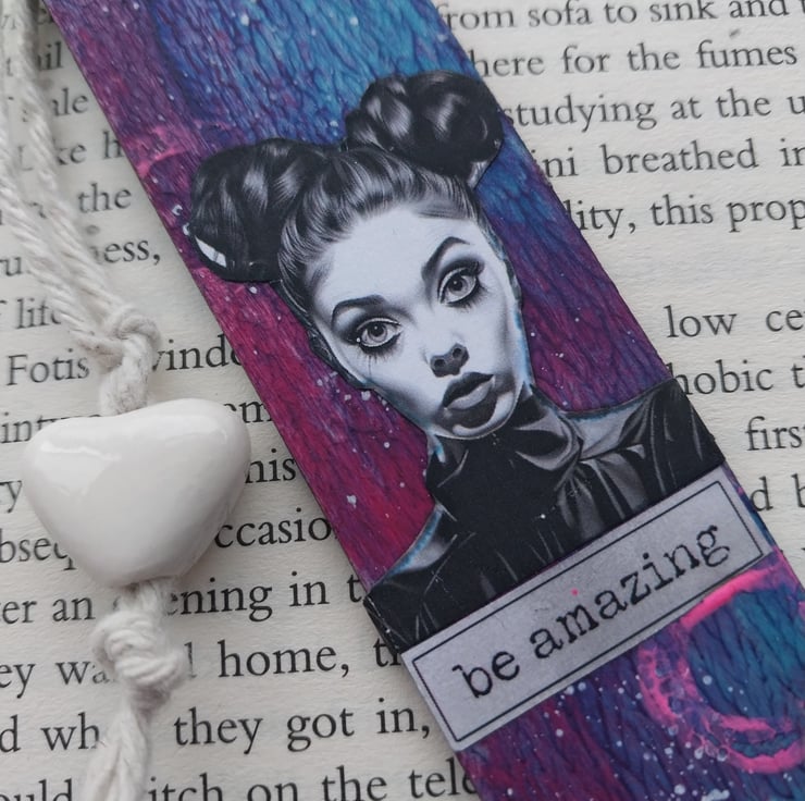 "Be Amazing " is wooden bookmark with a watercolour background and girl character which is digital art.