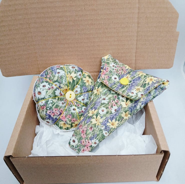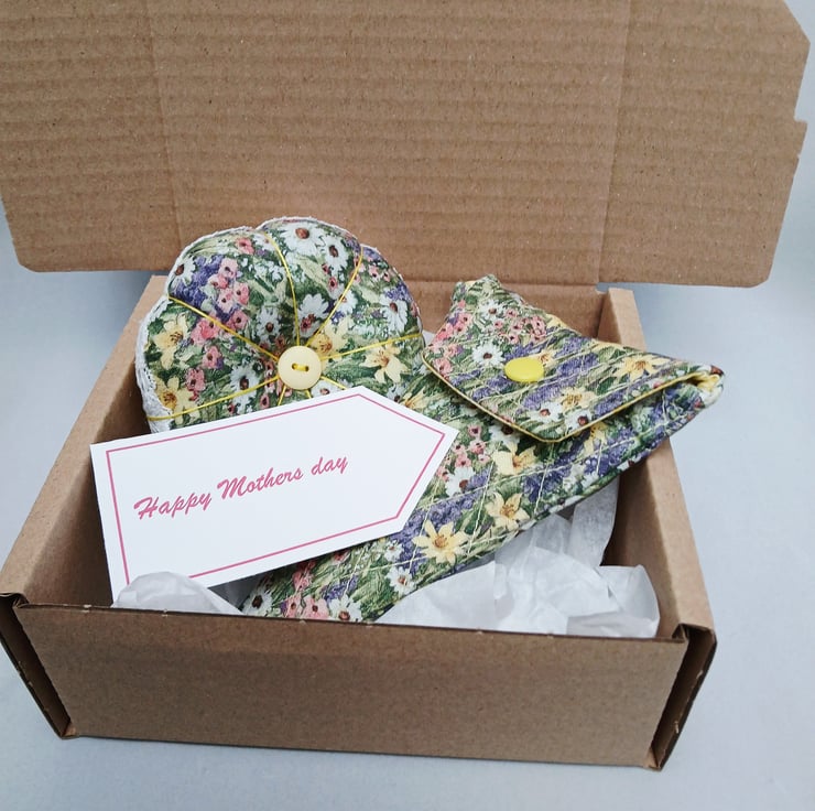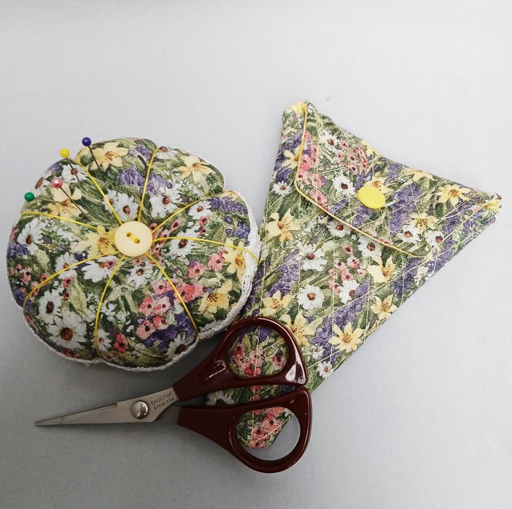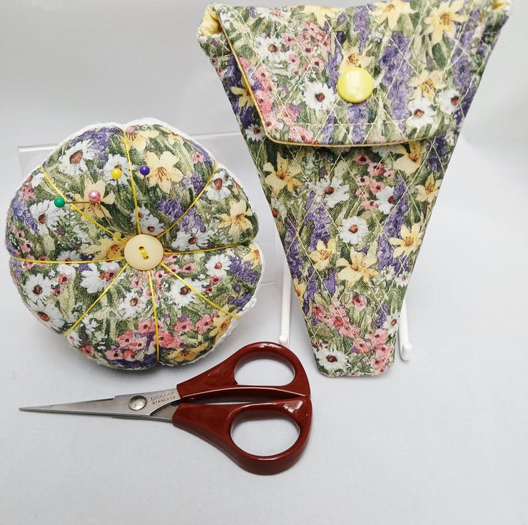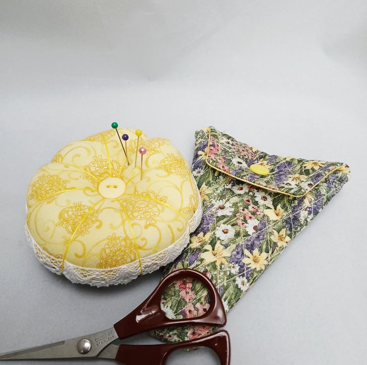 Pin Cushion (reversible) and Scissor Case . A Pin cushion and scissor case made from a lovely Spring like flowered fabric. The Pin cushion is reversible with flowered fabric one side and the other side is a mottled yellow fabric, features a complimenting button on both sides. The edge is embellished with white lace. The diameter of the pin cushion is 4". The quilted scissor case is 5.5" long and measures 4" across the top. The inside lining is yellow the same as one side of the pin cushion. This will make an ideal gift or perhaps treat yourself. . A perfect Mothers Day gift. If you let me know that you are purchasing for Mothers Day I will include a gift tag for you, as in images.