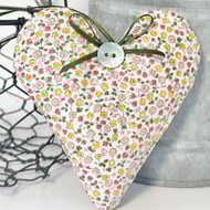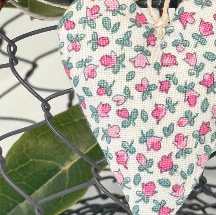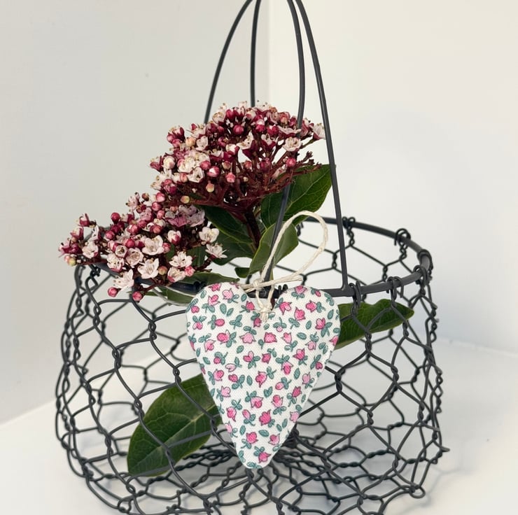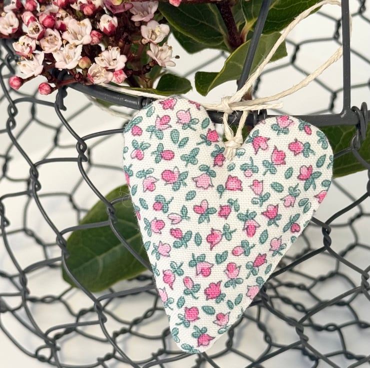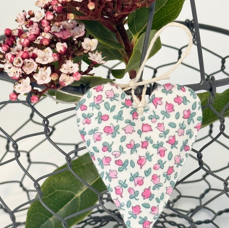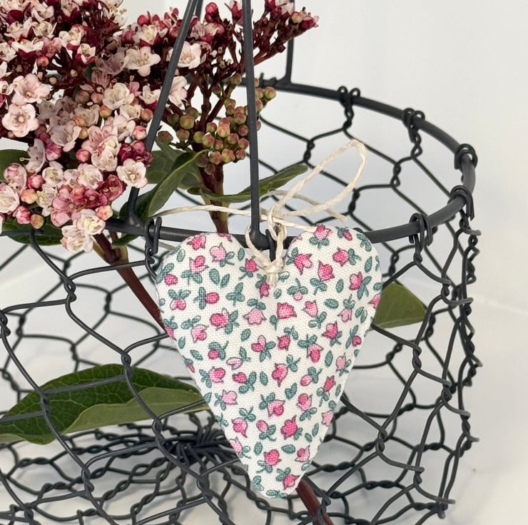 Tiny pink flowers tumbling over a white background, this beautiful mini heart decoration is made in Liberty print Lazenby cotton and is generously filled with fragrant Hampshire lavender, with natural twine hanging ties.