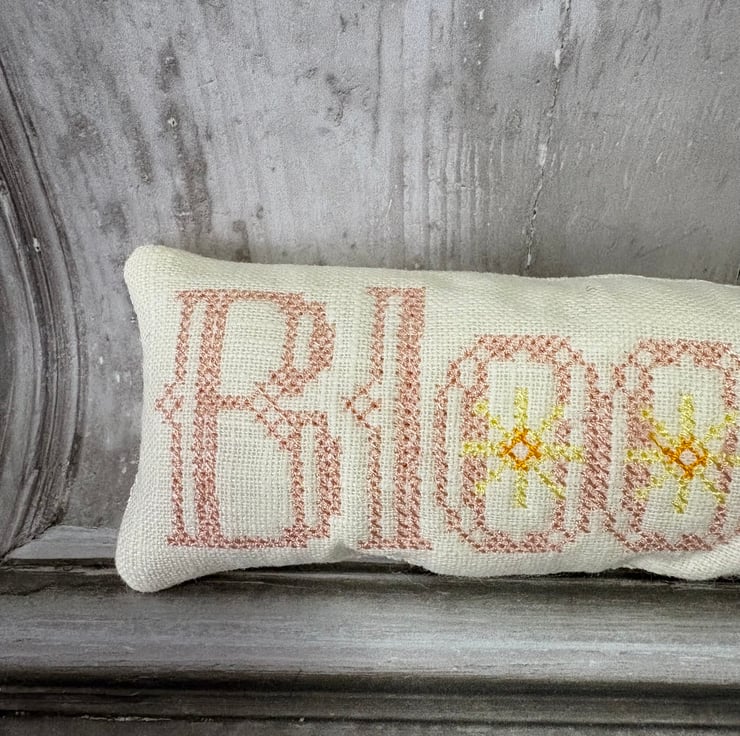 Bowl Filler machine embroidered cross stitch design. Measuring 5.5” x 2". Perfectly Pale prewashed linen fabric filled with polyester fibrefill. Little pillows of fun. Select 1 or fill a bowl full of Spring colours.
