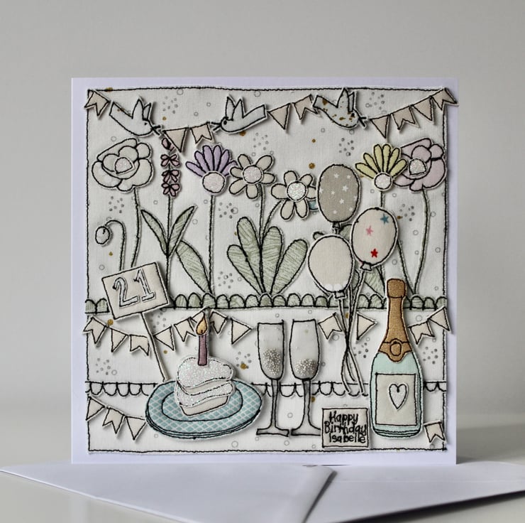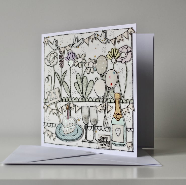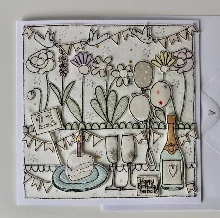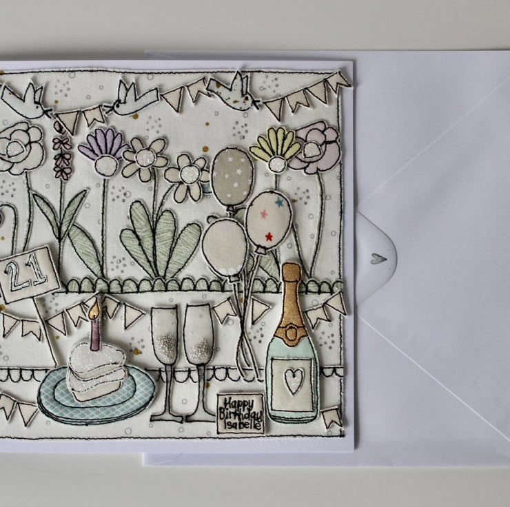This handmade card has been sewn by me and my sewing machine, using cotton cloth, metallic fabric, glitter cloth and 100% wool felt; making it totally unique.